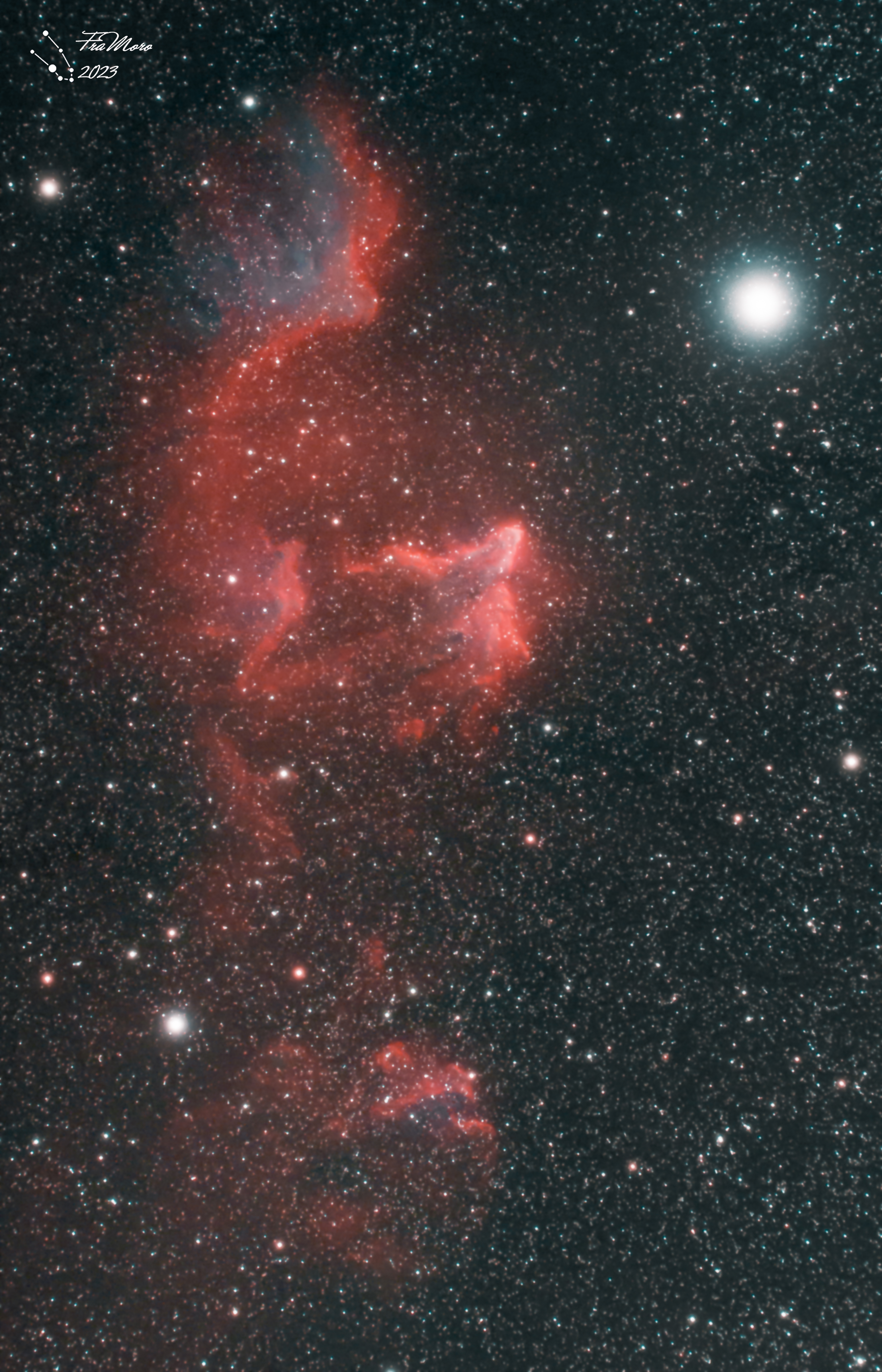 Il bagliore e l’aspetto etereo rendono la nube simile a un’apparizione spettrale nelle profondità dello spazio. IC59 e IC63 sono conosciute nel loro complesso anche come Sharpless 2-185 (Sh2-185), si distinguono visivamente nella loro diversità di colore e forma. Le due nebulose sono irradiate dalla luce emessa dalla stella γ Cassiopeiae. IC63 (Nebulosa Fantasma) ha forma triangolare, ha emissioni ottiche dominate dal colore rosso, dato dall’idrogeno ionizzato dalla radiazione ultravioletta della stella frammisto a filamenti bluastri. Più lontano dalla stella si trova IC59, con una forma simile a una campana, ed una colorazione tendente al blu che deriva da luce della stella riflessa dalla polvere nebulare. Entrambe le nebulose stanno lentamente dissolvendosi sotto l’influsso del violento vento stellare emesso da γ Cassiopeiae.