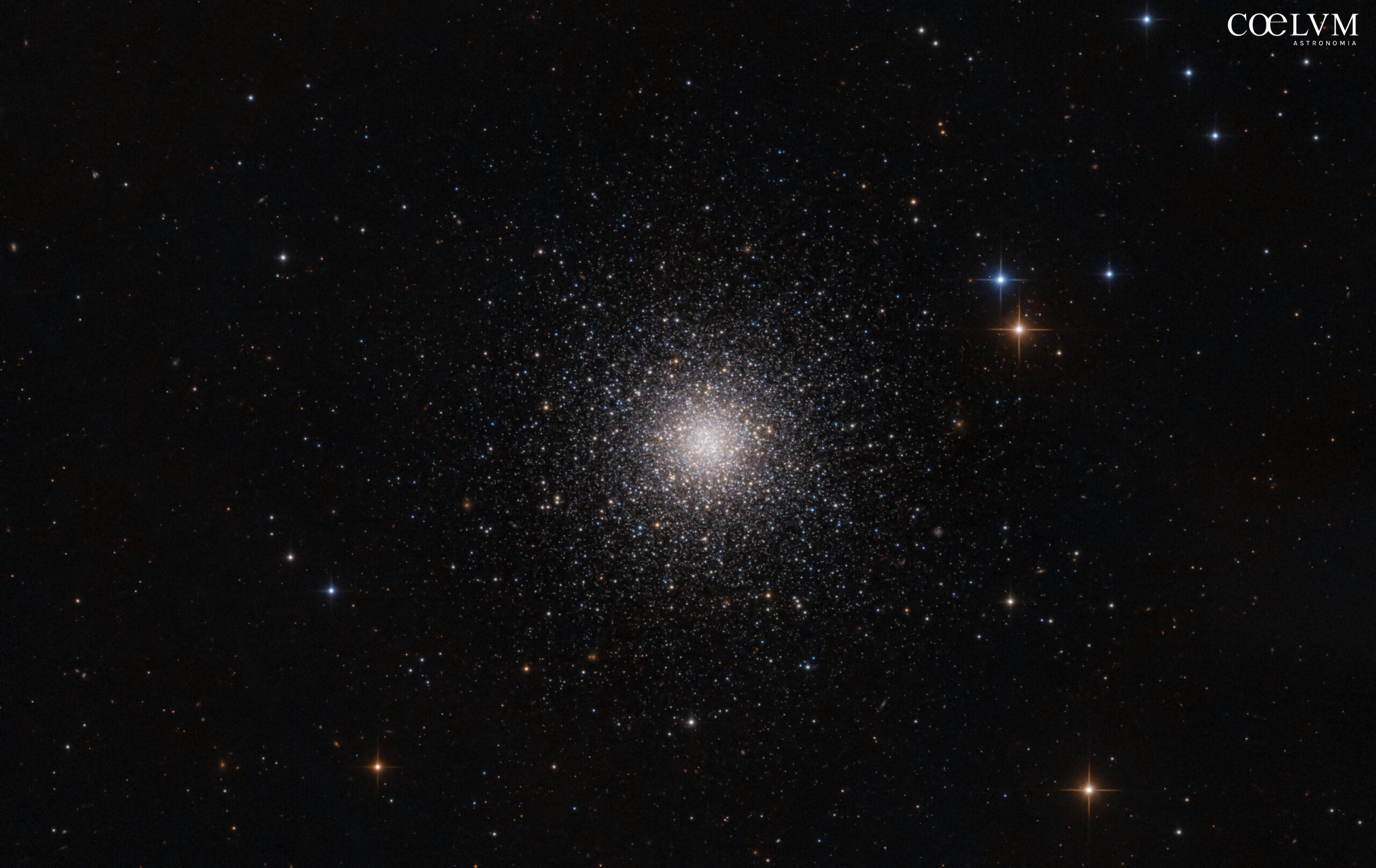 Questa immagine è il risultato di circa 2 ore di acquisizione con un telescopio da 17″. Messier 53 fu scoperto dall’astronomo tedesco Johann Elert Bode nel 1775 e osservato nuovamente da Messier nel 1777, che lo incluse come 53° oggetto nel suo catalogo. M53 dista 60.000 anni luce dal centro galattico e circa la stessa distanza dal nostro sistema solare, il che lo rende uno degli ammassi globulari più distanti dalla Terra. Ha una magnitudine apparente di 8,3 e può essere osservato attraverso un piccolo telescopio nella costellazione della Chioma di Berenice. Gli ammassi globulari sono molto più vecchi e più grandi degli ammassi aperti, quindi ci si aspetta generalmente che contengano più stelle rosse, anziane, e meno stelle blu, giovani. In effetti, M53 è considerato un ammasso povero di metalli. Le misurazioni dell’abbondanza degli elementi nelle giganti rosse dell’ammasso suggerisce che la maggior parte sono stelle di prima generazione. Cioè, non si sono formate dal gas riciclato da stelle di precedenti generazioni nell’ammasso. Questo differisce dalla maggior parte degli ammassi globulari, che sono maggiormente dominati da stelle di seconda generazione. Ma Messier 53 ha sorpreso gli astronomi con il suo insolito numero di un tipo di stelle blu, chiamate “blue stragglers”, vagabonde blu. Si presume che tutte le stelle di un ammasso globulare si siano formate più o meno nello stesso periodo (circa 12,5 miliardi di anni fa per M53), quindi si prevede che abbiano all’incirca la stessa età. Ma le vagabonde blu sembrano essere più luminose e più giovani di quanto dovrebbero essere. Sebbene la loro natura precisa rimanga misteriosa, si ritiene che questi oggetti insoliti si siano formati da incontri ravvicinati, forse collisioni, tra stelle nei centri affollati di ammassi globulari come M53. Osservando attentamente, si noterà anche che ci sono decine di piccole galassie sparse nel campo.