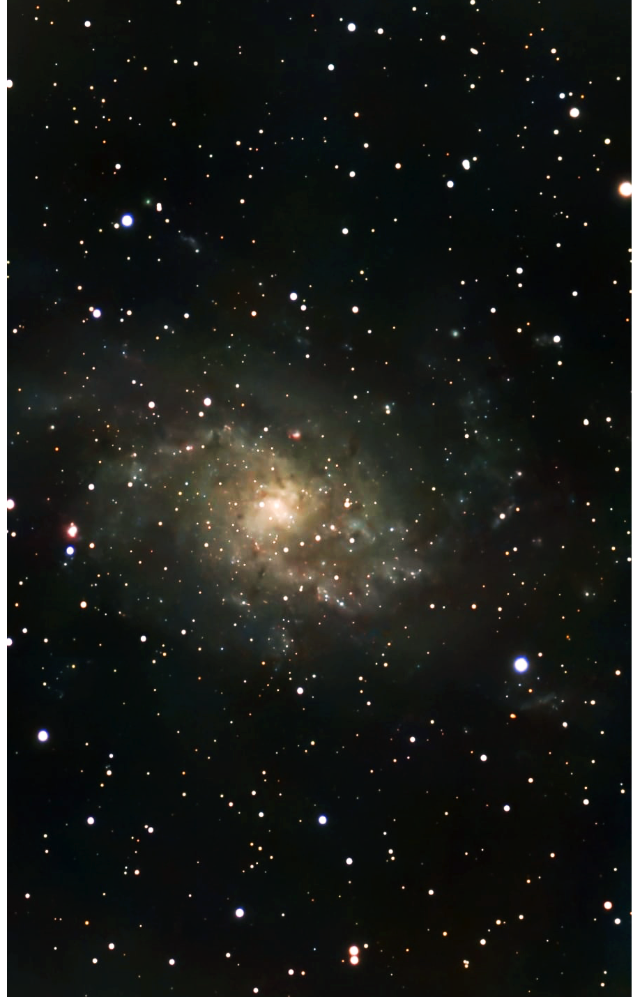M33 o NGC 598, Galassia del Triangolo dista da noi 2,7 milioni di anni luce circa. E’ la terza galassia più grande del GRUPPO LOCALE dopo Andromeda (M31) e la Via Lattea. Ha un diametro di 60.000 aL , la metà circa della nostra. Ha una struttura spiraliforme di tipo SA e al suo interno si apprezzano moltissime nebulose a emissione, ricche regioni HII di eccezionale estensione tra cui la celebre NGC 604 visibile nella foto. Ripresa di 2ore e 15 minuti in un cielo con luna gibbosa crescente con il Seestar S50.