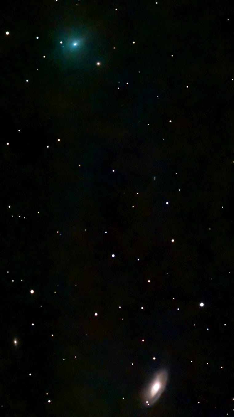 La Cometa 24 P Schaumasse ripresa il 28 dicembre 2025 quando la galassia M 88 (NGC 4501) faceva da cornice perfetta all’astro. La M 88, visibile nella Costellazione della Chioma di Berenice, appartiene all’Ammasso della vergine. E’una galassia a spirale ed ha dimensioni superiori alla Via lattea. Dista 50 milioni di anni luce dalla terra.
