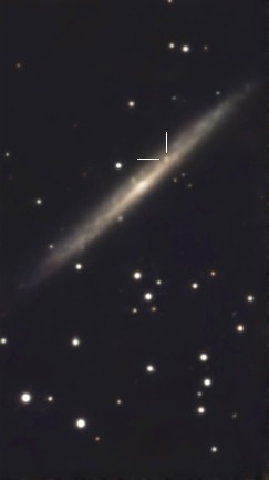 Nella galassia a spirale NGC 5907, ( di coltello) è stata scoperta il 22.04.2026 una Supernova di tipo SNII la SN 2026Kid. Il 24 Aprile ho potuto immortalare questa scintillante esplosione stellare con il seestar S50, uno straordinario spettacolo che ci riporta alla potenza ed alla bellezza dell’Universo. La Galassia è situata nella costellazione del DRAGONE ad una distanza di 50 milioni di anni luce; calcolata una magnitudine di 11,7. E’ stata scoperta da W. Herschel nel 1788 e risulta composta nella stragrande maggioranza da giovani stelle nane, carente di quelle giganti . Nella stessa nel 1940 è stata scoperta un’altra Supernova, la SN 1940. Occorre ricordare che questa Galassia nel 1850 fu catalogata come due oggetti separati, NGC 5906 e NGC 5907. In realtà si è potuto dimostrare che si tratta di una sola galassia tagliata in due dalla intensa polvere interstellare.