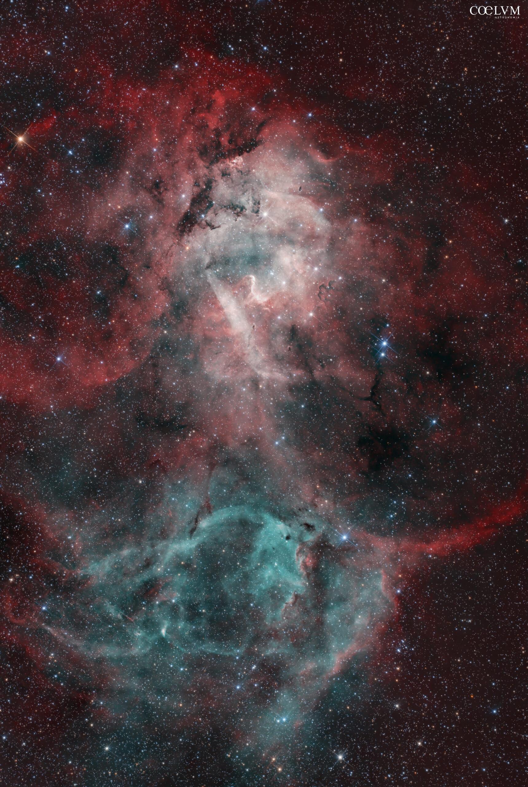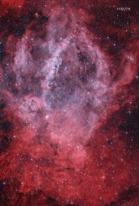 Situata a 10.000 anni luce in Cefeo, questa vasta regione H II è celebre per la sua forma a “leone ruggente”. La sua complessa struttura emerge solo attraverso la fotografia a lunga esposizione. . Per questo scatto ho elaborato i dati grezzi per mettere in evidenza i singoli elementi. Si tratta di una composizione HOO dove l’unione dei segnali Idrogeno-Alfa (rosso) e Ossigeno III (ciano) dà vita alla testa del Leone. Mentre l’Idrogeno ne delinea la struttura portante, l’Ossigeno si concentra nel cuore della nebulosa, creando contrasti cromatici e una profondità che esalta l’interazione tra i diversi elementi chimici. . Caratteristiche fotografia 4h di esposizione totali Light: 12 da 1200s Gain 120 Offset 8 temperatura -10° +dark e flat . Caratteristiche Telescopio Ottica skywatcher 130 pds f5 (650mm di focale) Correttore di coma baader Mark III Montatura equatoriale armonica ZWO AM 3 Camera Zwo Asi 294 MC PRO Color raffreddata Filtro L’Para Guide scope 30 /120 Camera guida asi 120 mc . Elaborazione: PixInsight, Photoshop 2025