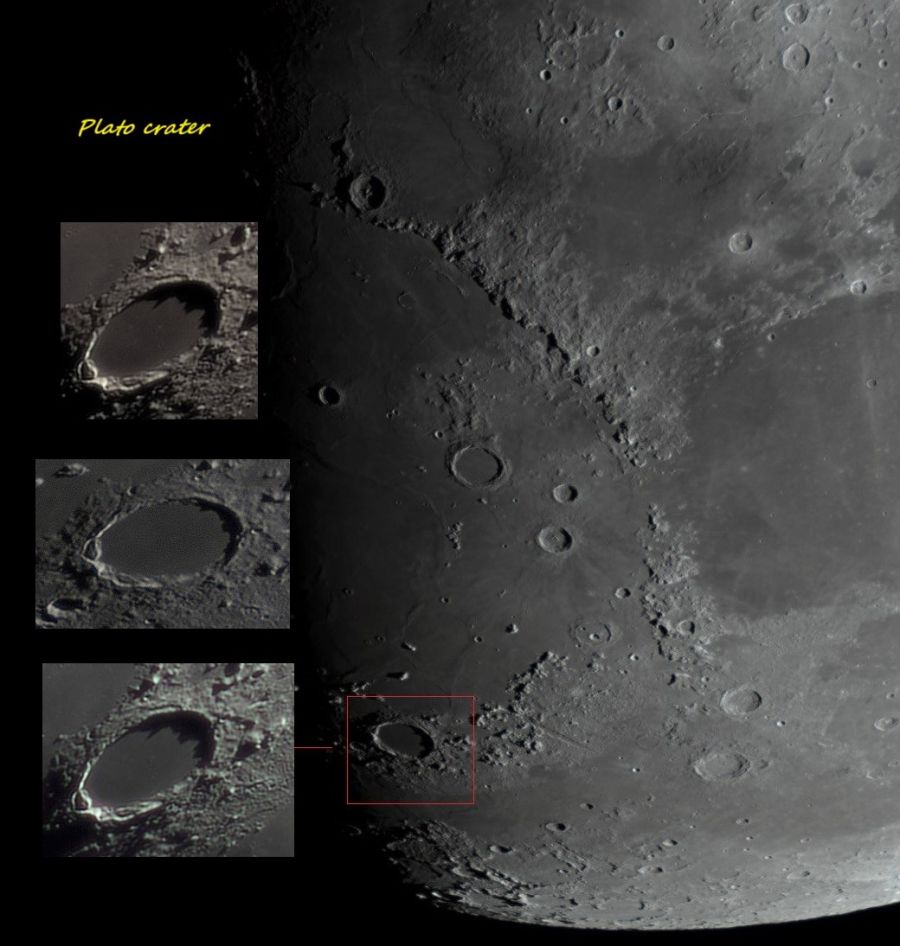 All’osservazione diretta con telescopio il cratere Plato sembra avere una struttura quasi omogenea, ma osservando le ombre al suo interno la sua quasi omogeneità lascia spazio a una struttura altamente frastagliata e spettacolare.