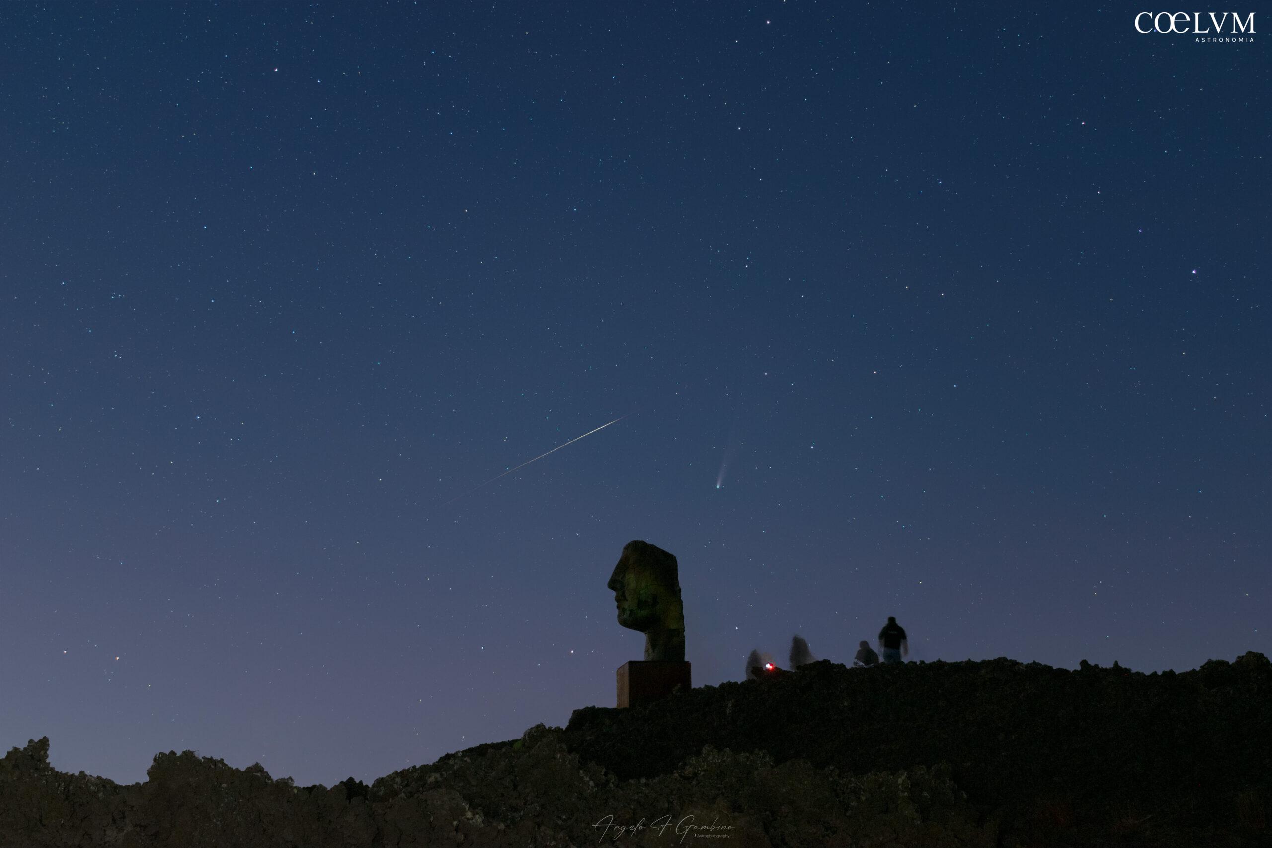 Tramonto della cometa C/2025 A6 (Lemmon) sull’installazione artistica del Teseo screpolato posta sul monte Etna. Integrazione di 8 immagini da 60 s ciascuna astroinseguite per il cielo e foto singola da 120 s per il panorama acquisite con Nikon D3300 + Minitrack LX2, ISO 400, f/4.8