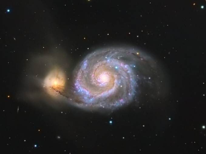 Crop sulla Galassia Vortice e sulla compagna IC4278. Si nota la struttura dei bracci a spirale costellati da numerose nebulose.