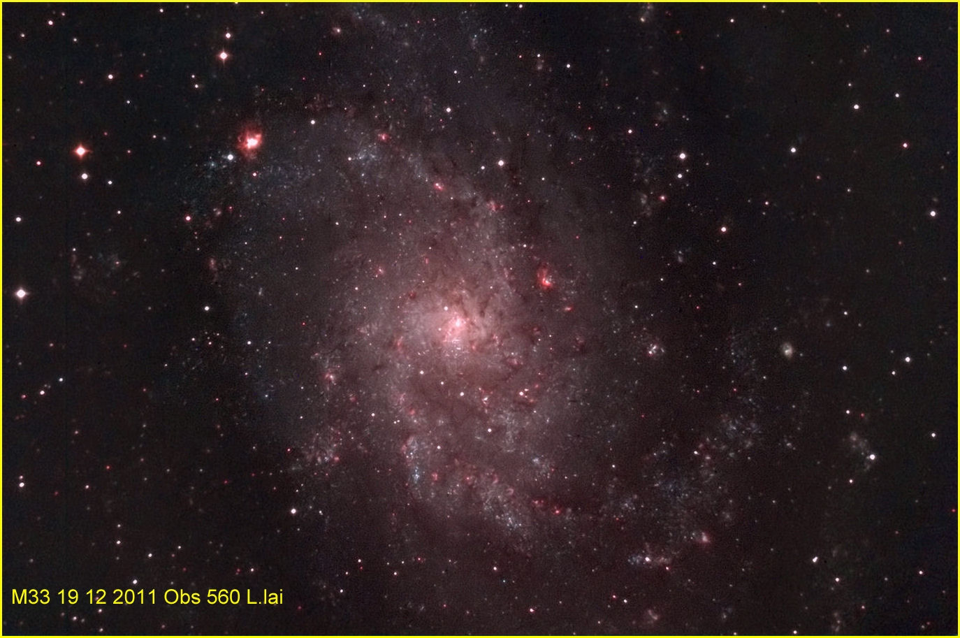 M 33 ha mostrato tutta la sua estensione e quante nubi di idrogeno possiede. Appena visibili anche le sue stelle.