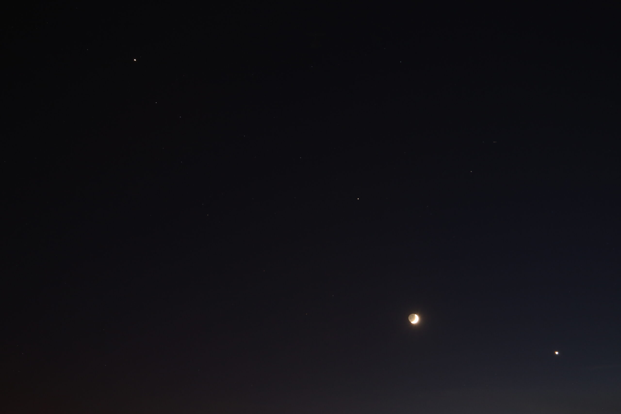 Il bel allineamento dei pianeti Giove, Saturno e Venere con Luna cinerea, illuminata al 15,8 %, età 3,8 giorni, con distanza dalla Terra 364.748 Km circa. Foto realizzata la sera del 7 dicembre 2021 alle ore 17,37.