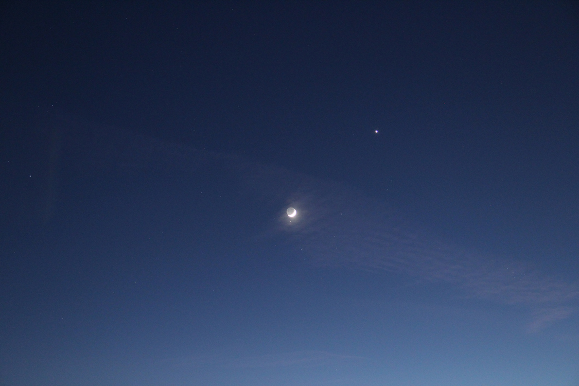 La congiunzione del 21 aprile 2015 della Luna con la Stella Alfa della costellazione del Toro, Aldebaran, con in alto a destra il luminoso pianeta Venere. Immagine effettuata alle ore 21,00 con Canon EOS 600D, teleobiettivo Canon 18/135 mm, su treppiede non motorizzato. Distanza focale 35 mm, F/4,5, esposizione manuale di 0,7 sec a ISO 1600.