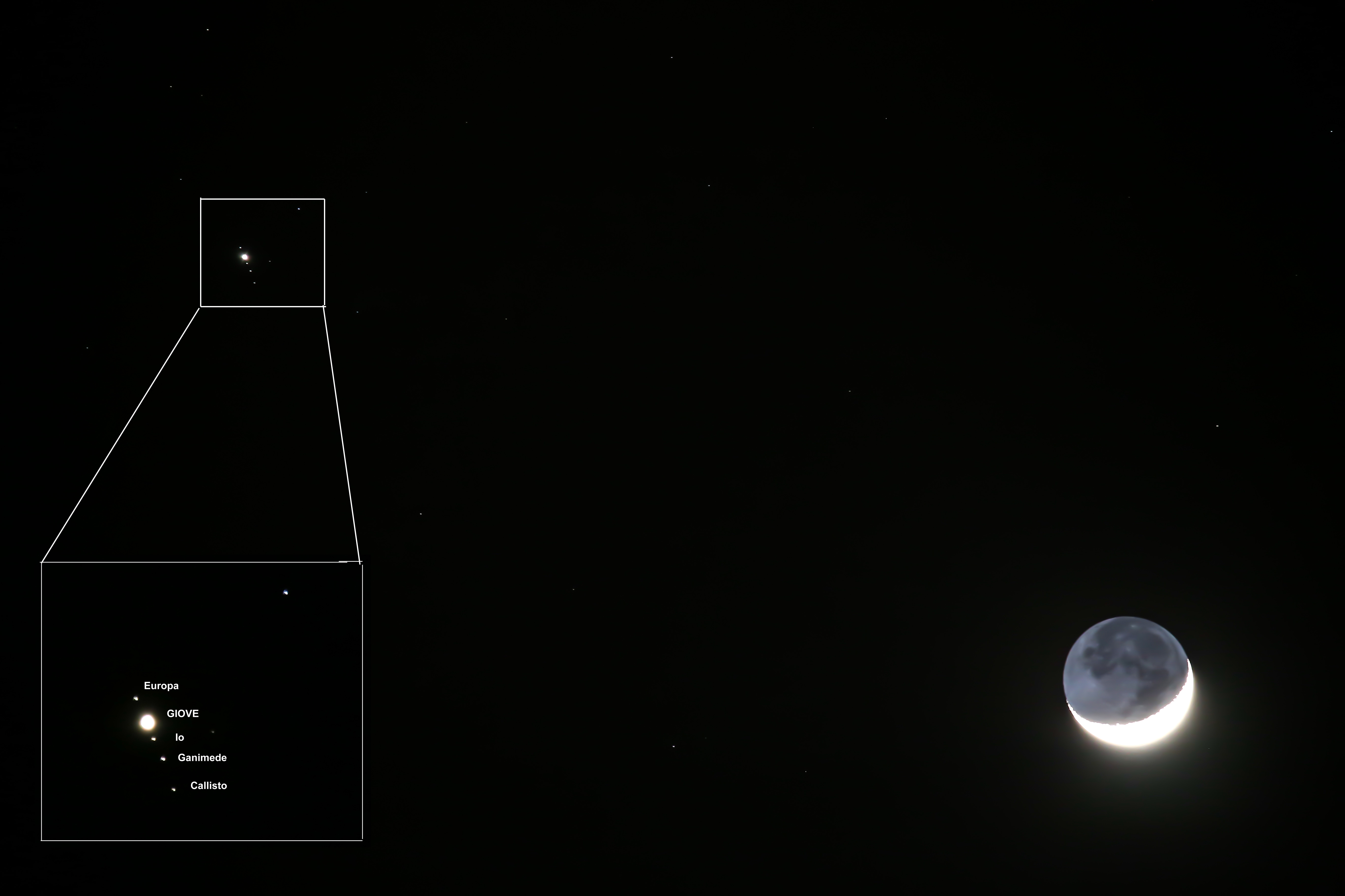 La bella congiunzione apparente tra la Luna, al quarto giorno e illuminata l 16%, e il pianeta Giove, la sera del 13 marzo 2024. La Luna dista dalla Terra 366.500 km circa, mentre Giove si trova a una distanza di ben 834.993 milioni di Km. Immagine realizzata alle ore 20,21, Canon EOS 6D, teleobiettivo SIGMA 150-500, focale di acquisizione 370 mm, a ISO 3200, con tempo di esposizione di 1/2 sec, apertura diaframma f/6,3.