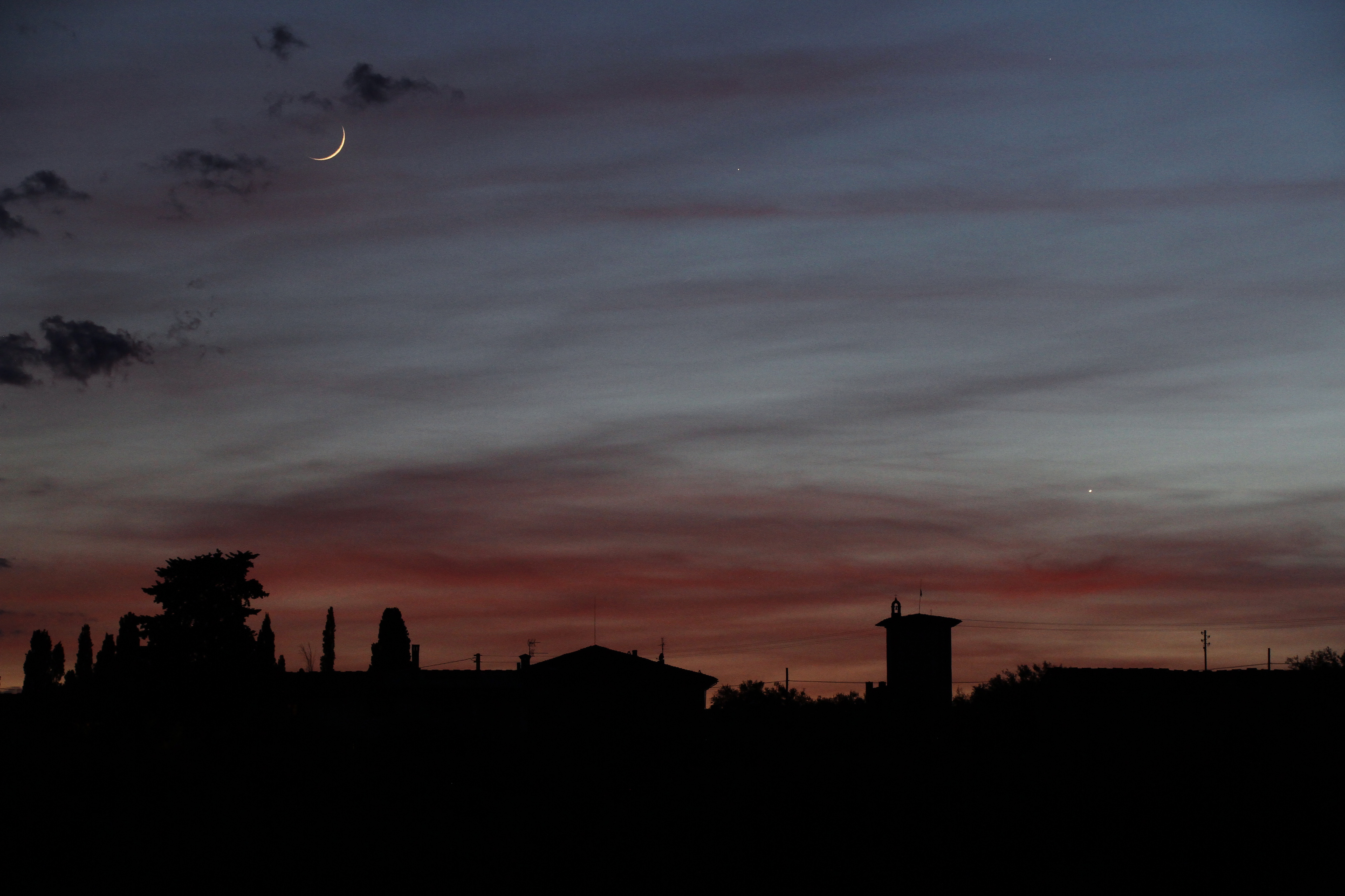 Un piccolo spicchio di Luna al secondo giorno, illuminata al 4,1 %, in congiunzione apparente con i due Pianeti interni del sistema Solare, Mercurio e Venere. Foto realizzata la sera del 24 maggio 2020 alle ore 21,32, con Canon EOS 7D, teleobiettivo SIGMA 18-300, ISO 800, f/7,1, tempo di esposizione ½ Sec, distanza focale 95 mm. Piccola elaborazione con Photoshop per migliorarne il contrasto e la luminosità.