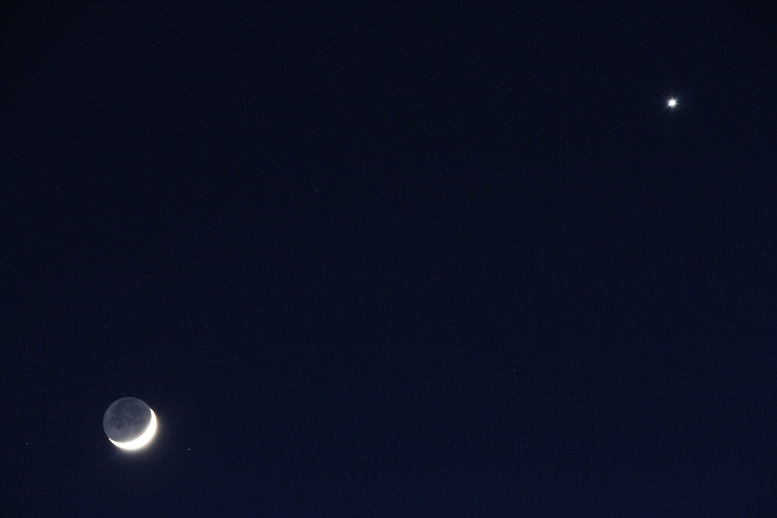 La congiunzione fra la Luna e Venere del 26 aprile 2020. Immagine realizzata alle ore 21,05, Canon EOS 7D, teleobiettivo SIGMA 18-300, focale di acquisizione 160 mm, a ISO 1600, con tempo di esposizione di 1,3 sec, apertura diaframma f/9. Piccola elaborazione con Photoshop per migliorarne il contrasto e la luminosità.