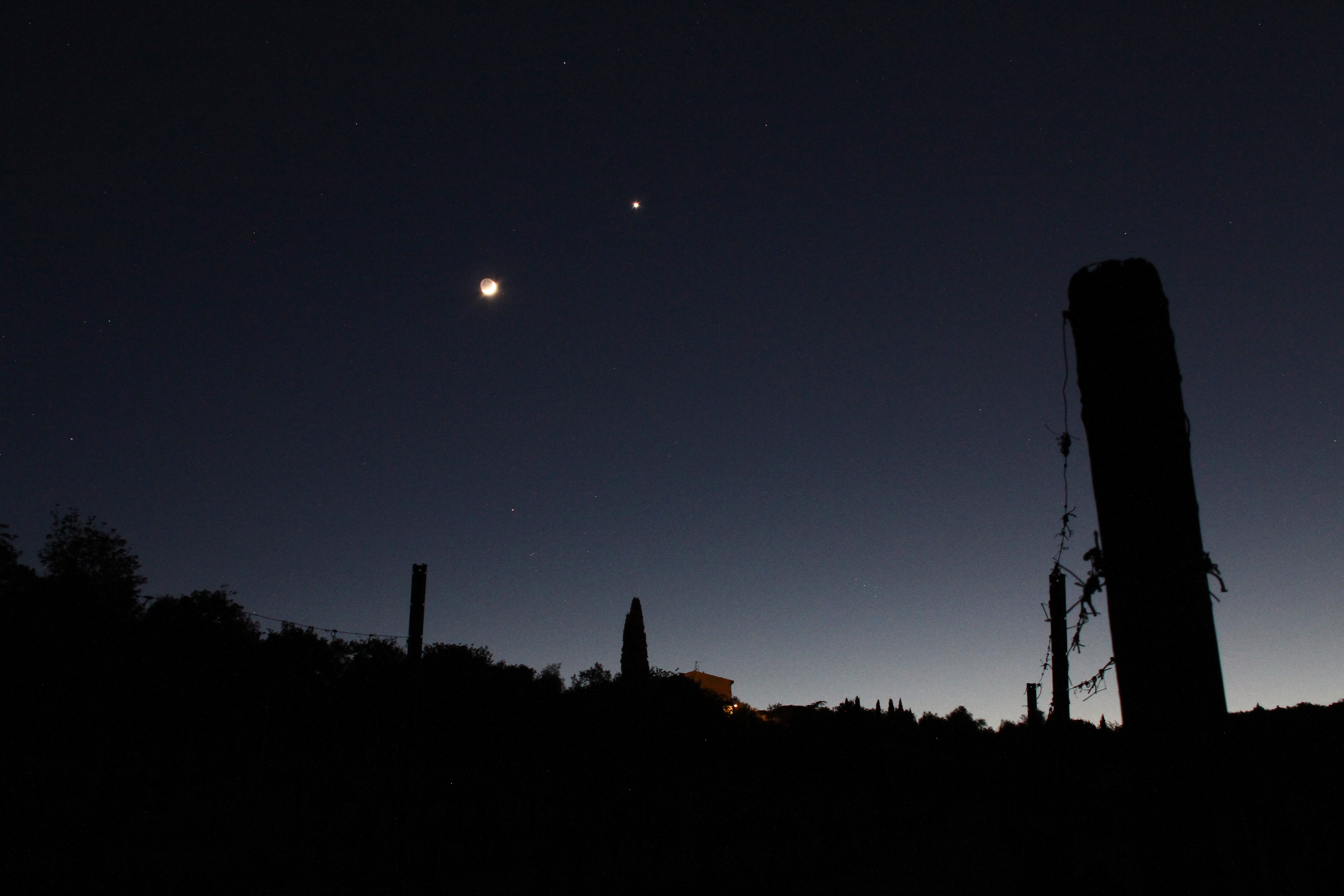La congiunzione fra la Luna e Venere del 26 aprile 2020. Immagine realizzata alle ore 21,09, Canon EOS 7D, teleobiettivo SIGMA 18-300, focale di acquisizione 26 mm, a ISO 1600, con tempo di esposizione di 2 sec, apertura diaframma f/8. Piccola elaborazione con Photoshop per migliorarne il contrasto e la luminosità.