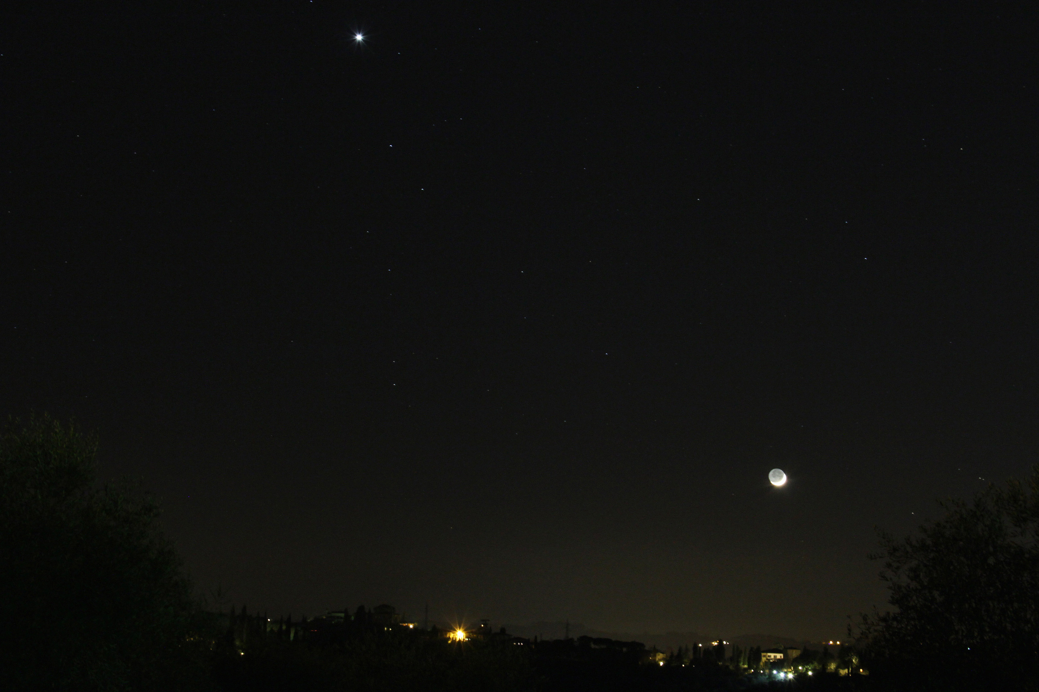 Luna, prossima al tramonto, con luce cinerea, illuminata al 5,5% perché da poco uscita dal Novilunio, con Venere ancora alta nel cielo, la sera del 31 dicembre 2016 alle ore 18,22. Reflex digitale Canon Eos 7D, con teleobiettivo Canon 18/135, Diam. 67 mm. Focale di acquisizione 36 mm, esposizione 13 sec, ISO 1000, f/9.