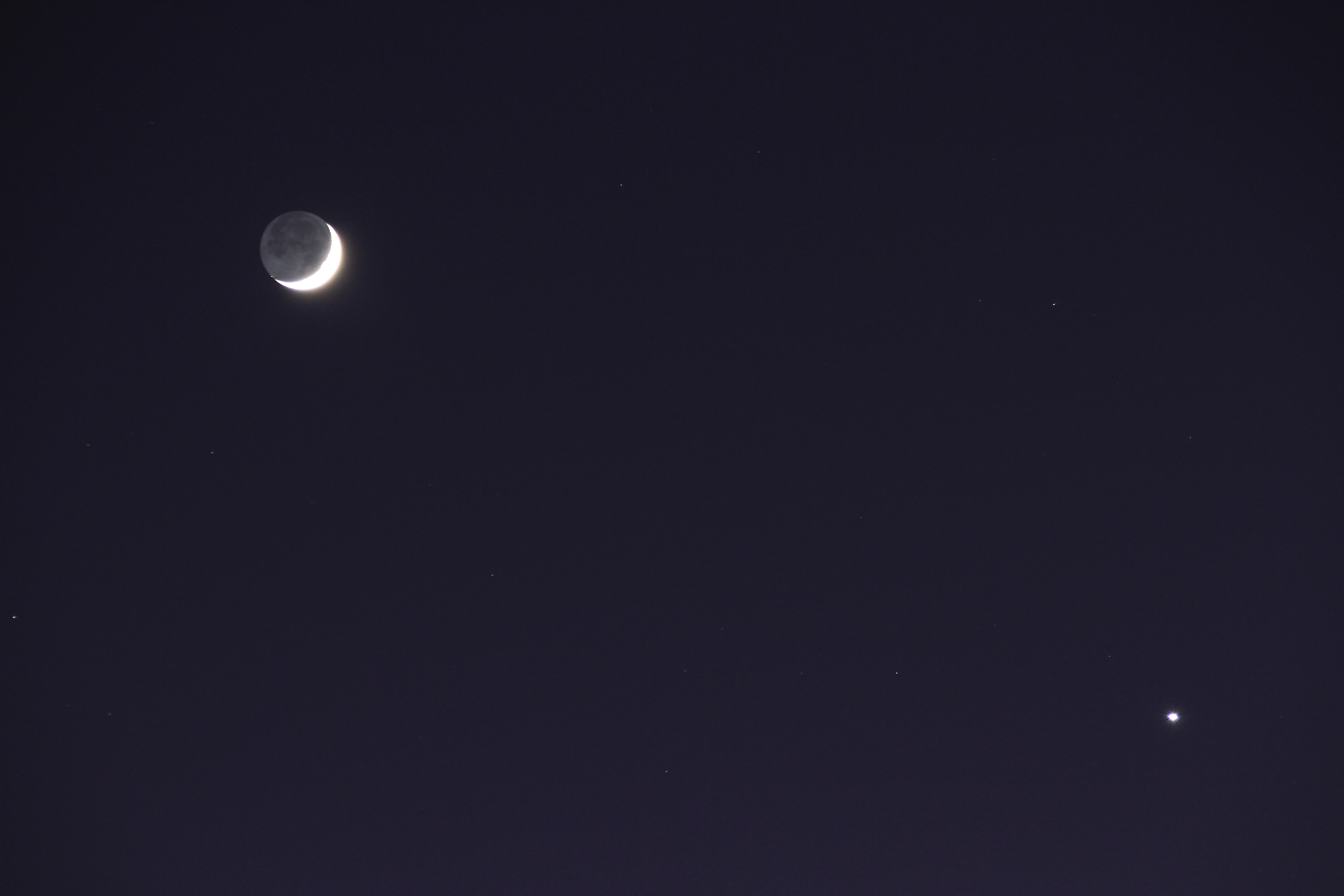 La congiunzione fra la Luna e Venere del 29 dicembre 2019 ripresa al tramonto da Bocca D’Arno (PI). Immagine realizzata alle ore 17,46, Canon EOS 7D, teleobiettivo SIGMA 18-300, focale di acquisizione 142 mm, a ISO 800, con tempo di esposizione di 1/3 sec, apertura diaframma f/7.1. Piccola elaborazione con Photoshop per migliorarne il contrasto e la luminosità.