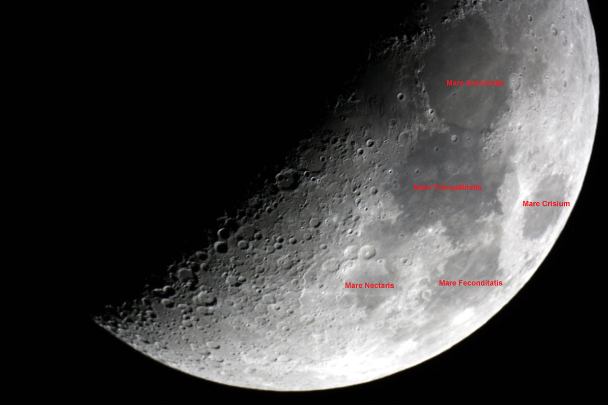 La luna al settimo giorno, illuminata al 43%, con il bel cratere Albategnus (dimensioni 139×139 km) al termine del bordo illuminato. Canon EOS 1000D, a fuoco diretto Celestron C8, su montatura LXD75, ISO 100, esposizione 1/25 sec