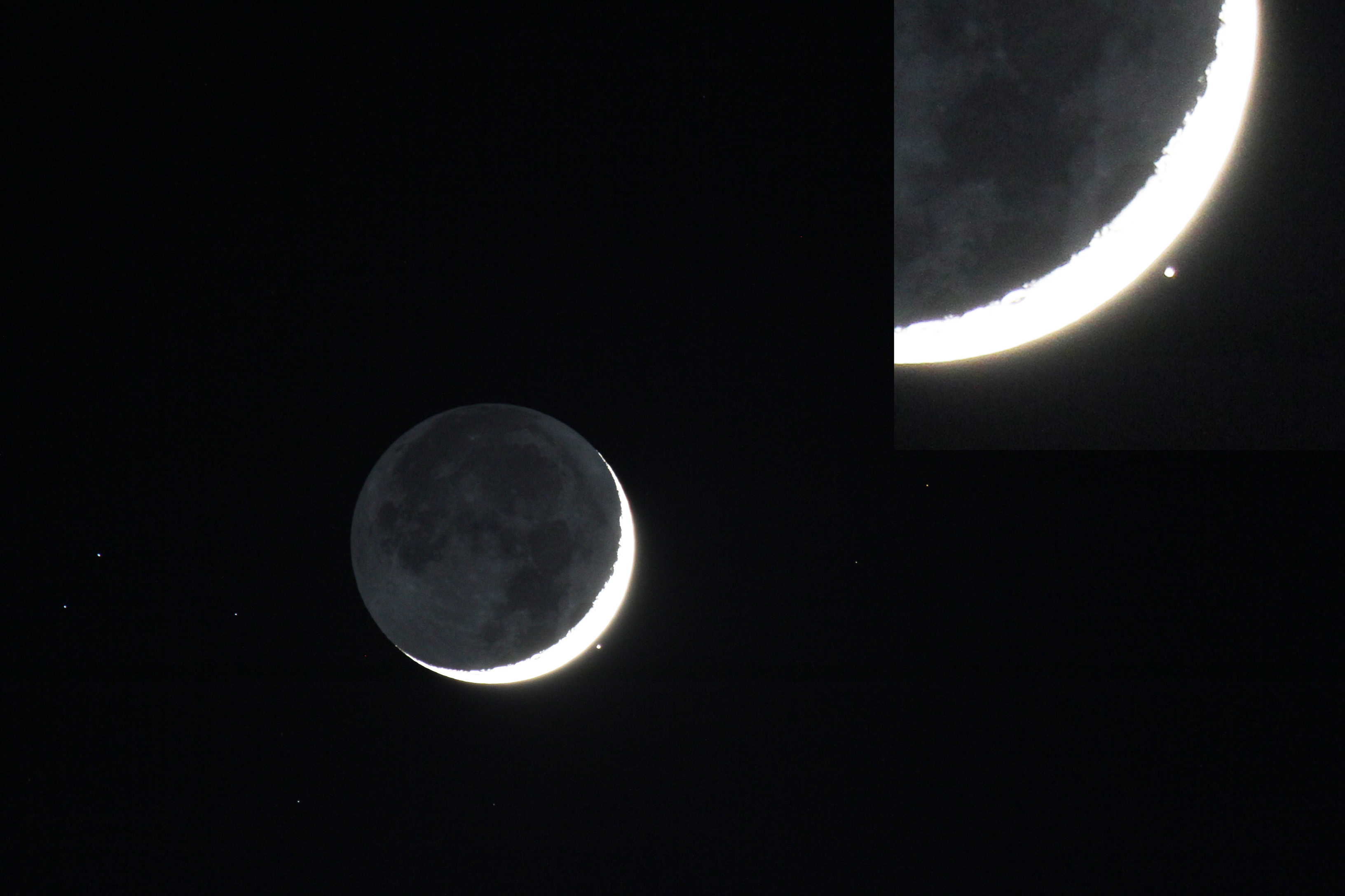 L’uscita di Aldebaran alle ore 21,19, dopo l’occultazione da parte della Luna (purtroppo l’ingresso è avvenuto a un ora in cui la luce del Sole era troppo forte e quindi quasi impossibile da riprendere). Fenomeno avvenuto la sera del 28 aprile 2017. Fotocamera Canon EOS 7D, teleobiettivo SIGMA 150-500, Diam. Obiettivo 86 mm, f/6,3, esposizione ½ secondo, ISO 800, distanza focale mm 500. Piccola elaborazione con Photoshop.