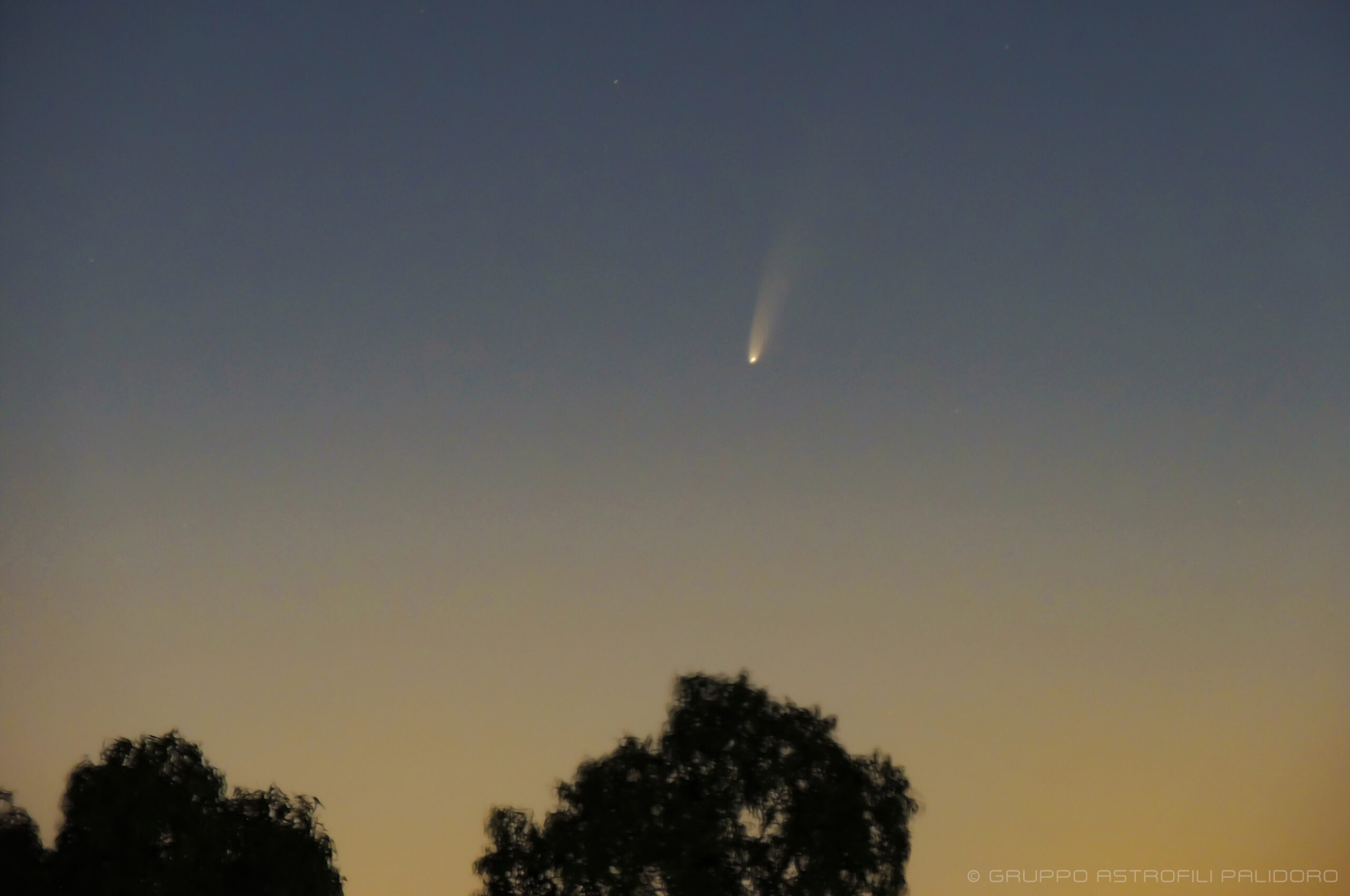 La Cometa C/2020 F3 Neowise è di recente scoperta ed è passata al perielio (punto più vicino al Sole) lo scorso 3 luglio. In queste immagini il Gruppo Astrofili Palidoro la mostra in tutto il suo splendore nelle prime ore del mattino. Le riprese sono state infatti effettuate alle 4:15 quando la luce del Sole si è iniziata a diffondere, infatti il tempo di visibilità di questa cometa è molto ristretto. E’ visibile per una mezz’oretta fino a quando la luce del giorno non la rende invisibile. Molto bassa sull’orizzonte è accompagnata dagli alberi delle campagne di Palidoro