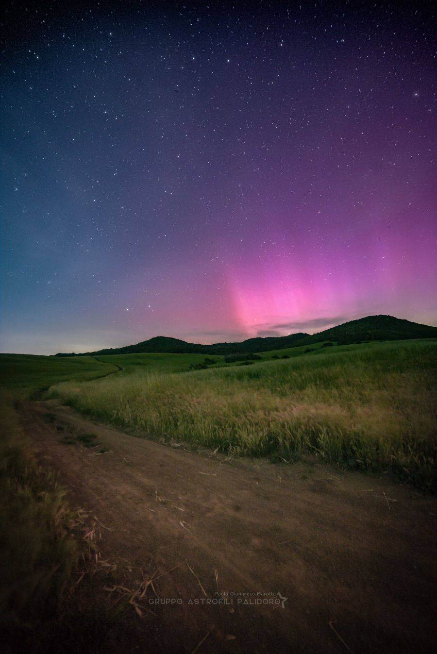 Composizione di tre foto con Sony A7III, samyang 14mm f2.8, 4s, iso 2500. Eccezionale vista dell’aurora boreale dalla campagna intorno a Roma, Cerveteri, Italia. Dieci minuti di cammino lungo un sentiero tra le tombe etrusche del Lazio, patrimonio dell’UNESCO.