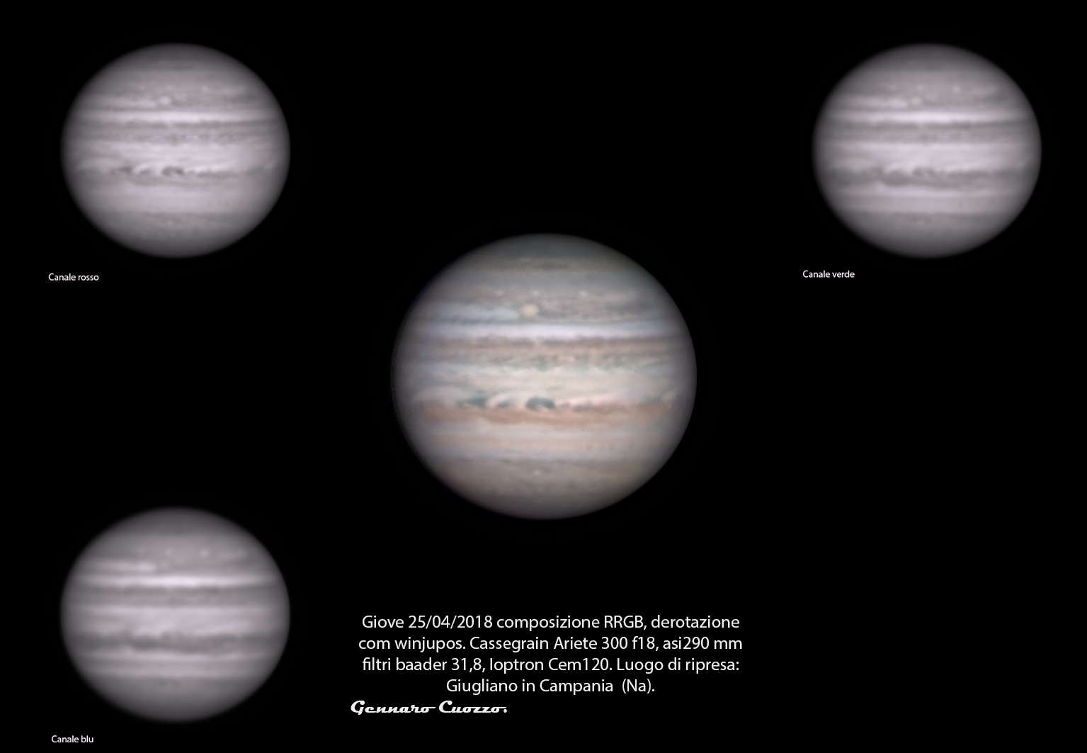 Composizione RRGb, de-rotato con Winjupos, sono 9 filmati per canale spalmati in circa 45 minuti.