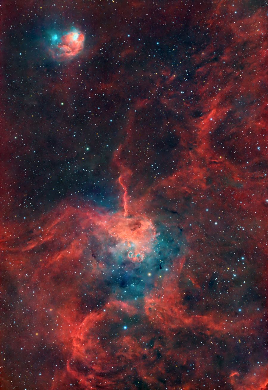 Questa insolita coppia di oggetti cosmici, due vaste nebulose nella Costellazione dell’Auriga ad una distanza di circa 10.000 anni luce dalla Terra, viene chiamata Il Ragno e la Mosca (The Spider and the Fly). La nube gassosa ricca di filamenti simili alle zampe di un ragno, visibile in basso di questa ricca ripresa, è in realtà una nebulosa a emissione chiamata IC 417, mentre la nebulosità più piccola in alto, catalogata NGC 1931, è una nebulosa a emissione e riflessione. Il Ragno è una vasta regione di formazione stellare, ricca di ammassi di giovani stelle, la cui luce cocente scolpisce cavità e filamenti nelle vicine nubi polverose. Anche nella Mosca, più compatta ed estesa per circa 10 anni luce, risplendono ammassi aperti di giovani stelle ardenti.