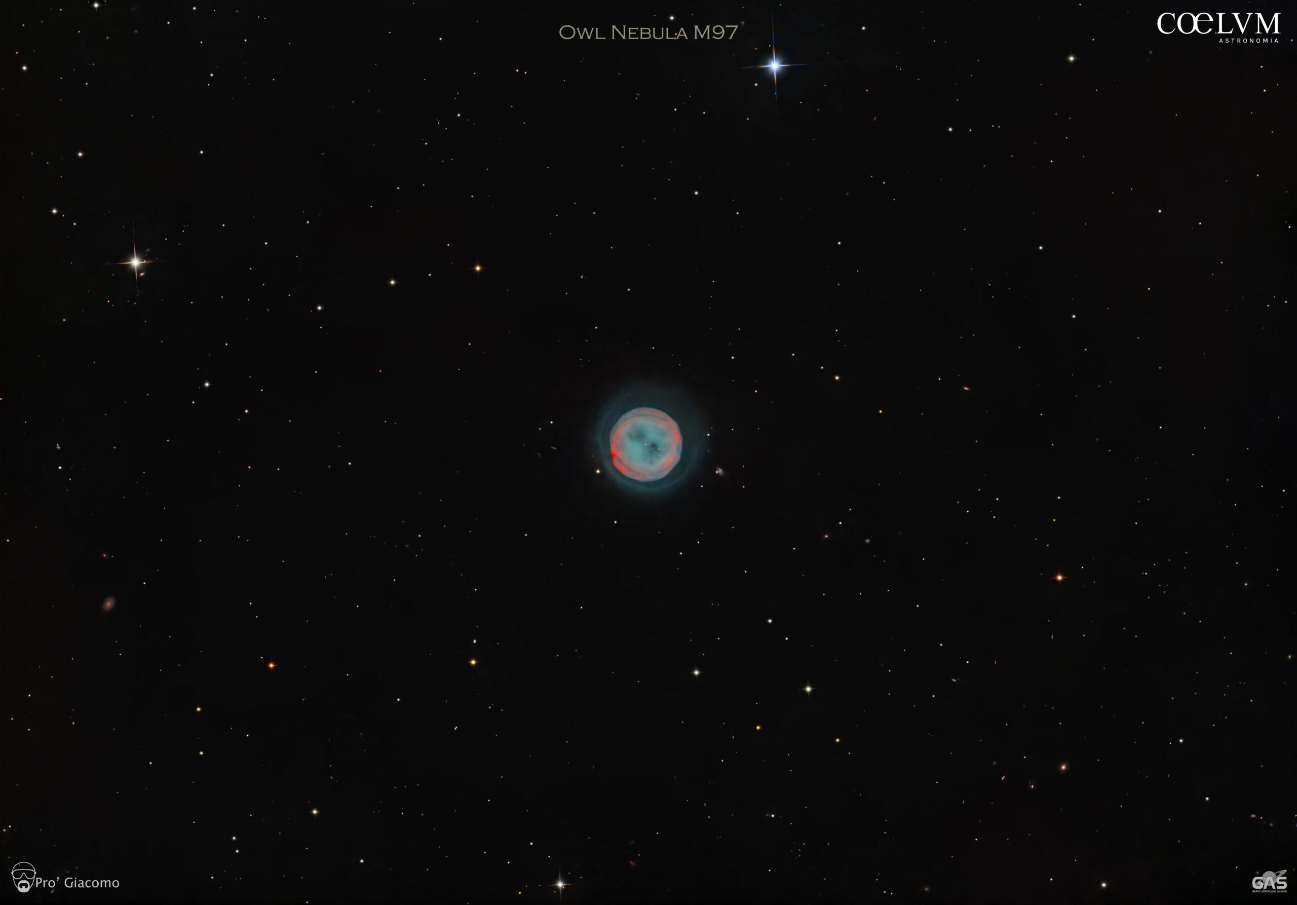 Nota anche con le sigle M 97 o NGC 3587 è una nebulosa planetaria visibile nella costellazione dell’Orsa Maggiore; è stata scoperta da Pierre Méchain nel 1781. Il nome “Nebulosa Gufo” è stato invece assegnato da William Parsons nel 1848 a causa delle due macchie scure, che assomigliano agli occhi di un gufo. M97 è una delle più grandi nebulose planetarie conosciute, in termini assoluti: si estende per un diametro di quasi 3 anni luce e la sua magnitudine apparente è pari a 9,9; la stella centrale invece è una nana bianca estremamente calda, di quattordicesima magnitudine, la cui temperatura superficiale si aggira sugli 85.000 kelvin e la sua massa sarebbe pari a 0,7 masse solari. La distanza dell’oggetto è stata a lungo oggetto di dibattito, ma oggi si tende ad accettare un valore di 2600 anni luce. La massa totale della nebulosa è di 0,15 masse solari e la sua densità è estremamente bassa, circa un decimo di quella media delle altre planetarie; ciò sarebbe indice dell’elevata età della nebulosa, dato che col tempo si è notevolmente espansa e i suoi gas si sono rarefatti. L’età sarebbe dunque sui 6000 anni. Light: 136 x 300” Filter: Optolong L-Para Camera: Asi 294 mc pro Telescope: Sky-Watcher 200/1000 PDS Mount: Skywatcher Eq 6-r Pro Acquisition: Asiair Plus Software: DSS – Pixinsight – Photoshop Shots: 23-25/02/2026 Location: Torricella (TA) ITALY Average moon phase: 48% Author: PRO’ GIACOMO.
