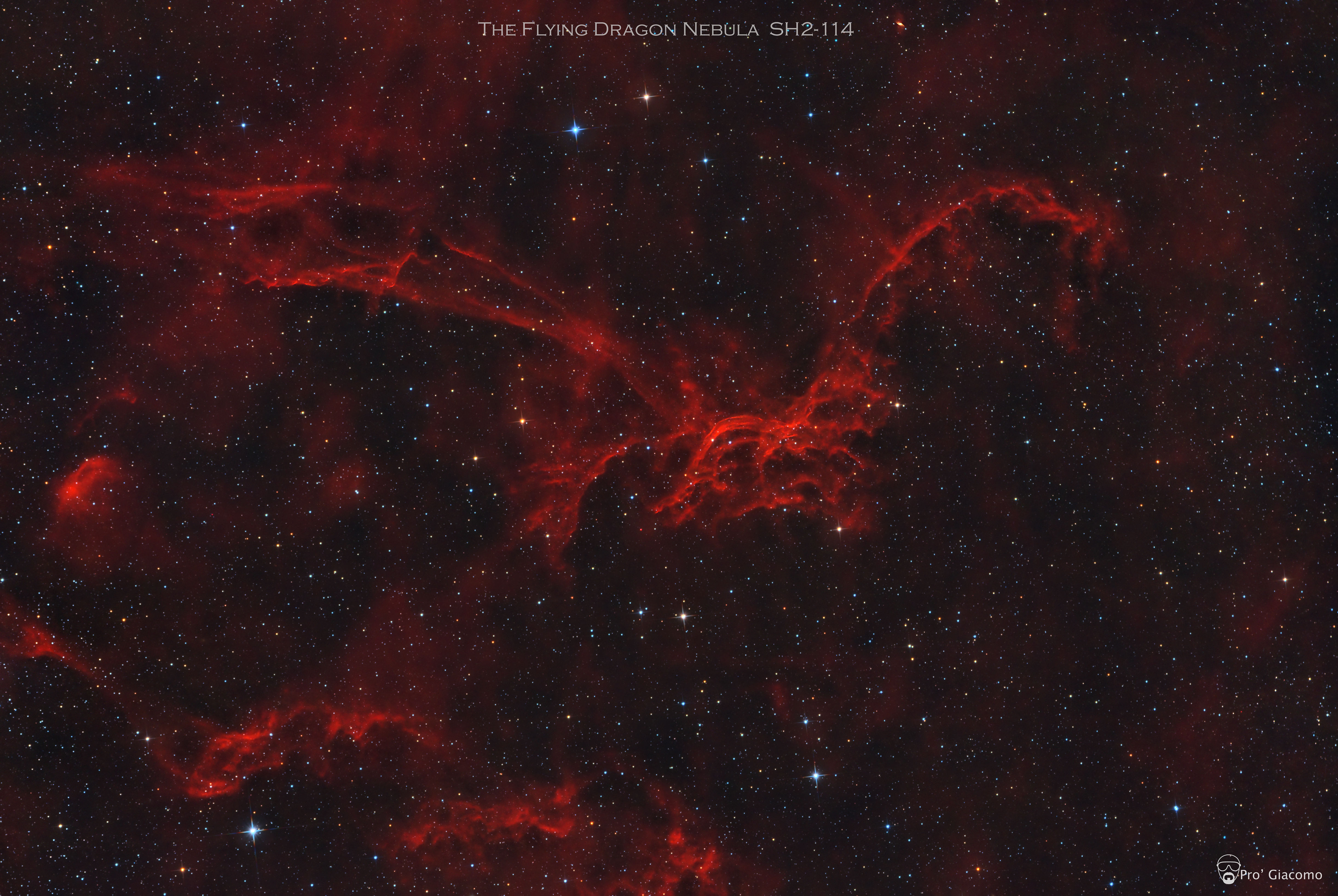 Sh2-114 è una debole nebulosa a emissione visibile nella costellazione del Cigno, denominata dagli anglosassoni “Flying Dragon Nebula” (“Nebulosa Drago Volante”), a causa della sua morfologia che la fa rassomigliare a un drago in volo.