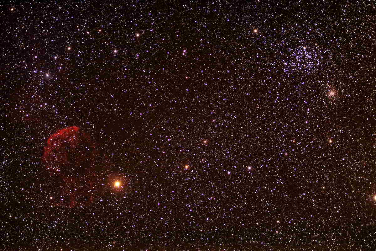 Due oggetti molto interessanti e dalla natura diversa qui ritratti contemporaneamente nello stesso campo: la nebulosa ad emissione IC443, la Nebulosa Medusa, e l’ammasso aperto M35, entrambi nella costellazione dei Gemelli.