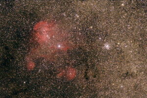 Le nebulose "Laguna" (M8) e "Trifida" (M20) riprese insieme da Hakos Farm, Namibia. Sono entrambi rintracciabili nella parte settentrionale del Sagittario e facilmente visibili, soprattutto la Laguna, anche ad occhio nudo in una notte limpida e senza luna. La estesa Laguna è una nebulosa diffusa in cui l’osservazione di globuli di Bok dimostra un’intensa formazione stellare; la simpatica Trifida deve il suo nome a cordoni di polvere che apparentemente la dividono in 3 parti