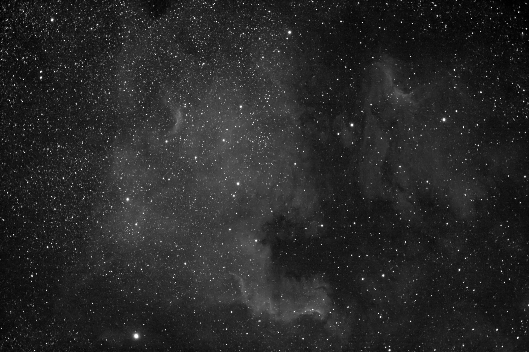 Nord America e Pellicano per la prima volta ripresi attraverso un filtro h-alfa Baader da 35 nm; trattamento in monocromia. Se qualcuno ha suggerimenti e indirizzi su come eseguire una tricromia con DSLR si faccia avanti con i commenti, sarò grato 🙂