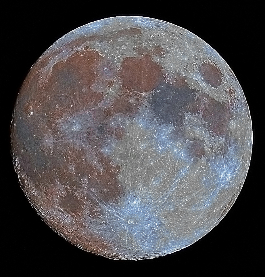 Non potendo riprendere oggetti deep-sky a causa della luna piena, ho ripiegato su quest’ultima cercando con la elaborazione di coglierne per grandi linee la composizione dei minerali di cui è costituita la superficie. E’ il mio primo tentativo del genere ed ho dimenticato di togliere il filtro anti inquinamento luminoso che in genere uso per il deep-sky. Un grazie all’amico Giuseppe Mauriello per la elaborazione e per avermene insegnato la tecnica