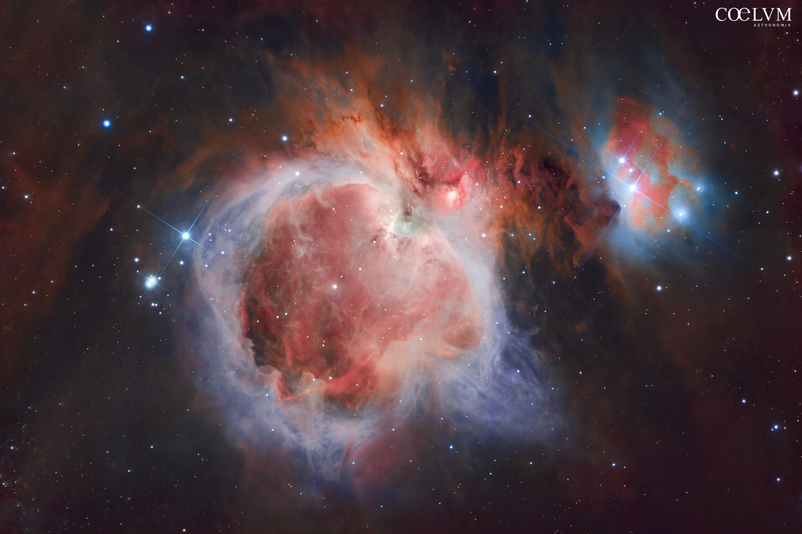 La nebulosa di Orione è tra le nebulose più brillanti del cielo invernale, riconoscibile anche piccoli binocoli come oggetto non stellare. E’ un’intensa regione di formazione stellare distante dal Sole circa 1400 anni luce Sulla sinistra, la nebulosa Running man. E’ una nebulosa ad emissione (le zone più rosse) e a riflessione (le zone azzurre). Ripresa fotografica effettuata in 4 serate differenti per un totale di 13 ore di acquisizione dati