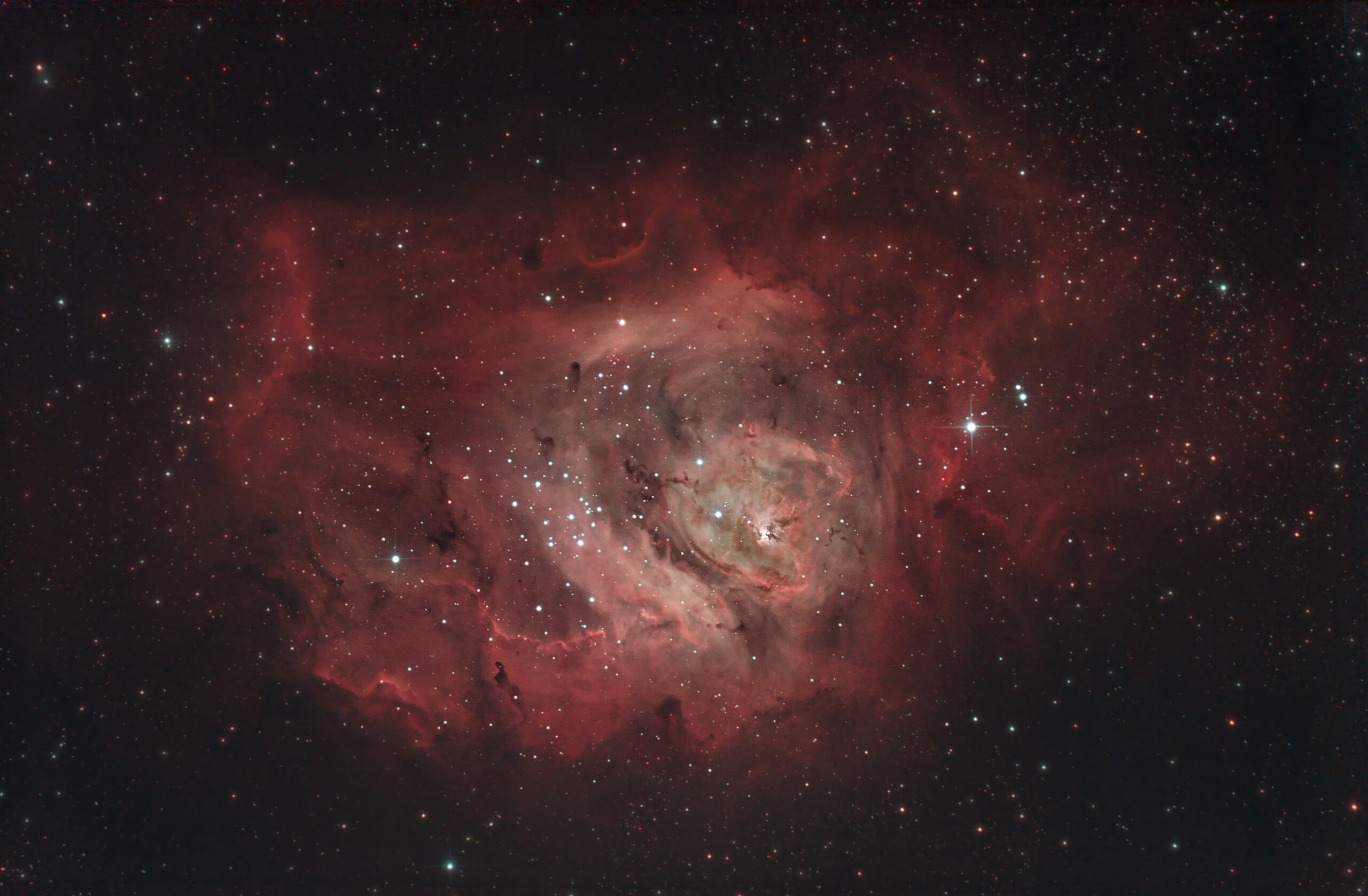 La nebulosa Laguna (M8) , distante 4100 anni luce dalla Terra , è visibile anche ad occhio nudo . Le dimensioni della nebulosa sono di circa 110 anni luce ( un anno luce corrisponde a 9461 miliardi di chilometri) Dati di ripresa : Colori RGB , ripresi il 24 giugno 2017 , con una Reflex Canon 700d non modificata , e filtro UHC Optolong eos clip . Luminanza Halpha : realizzata in 8 serate tra agosto e settembre 2019 , con una Canon 1100d full spectrum e filtro Ha 12nm . Tutte le foto sono state fatte da casa mia , con un telescopio 200/1000 e montatura Neq6 pro