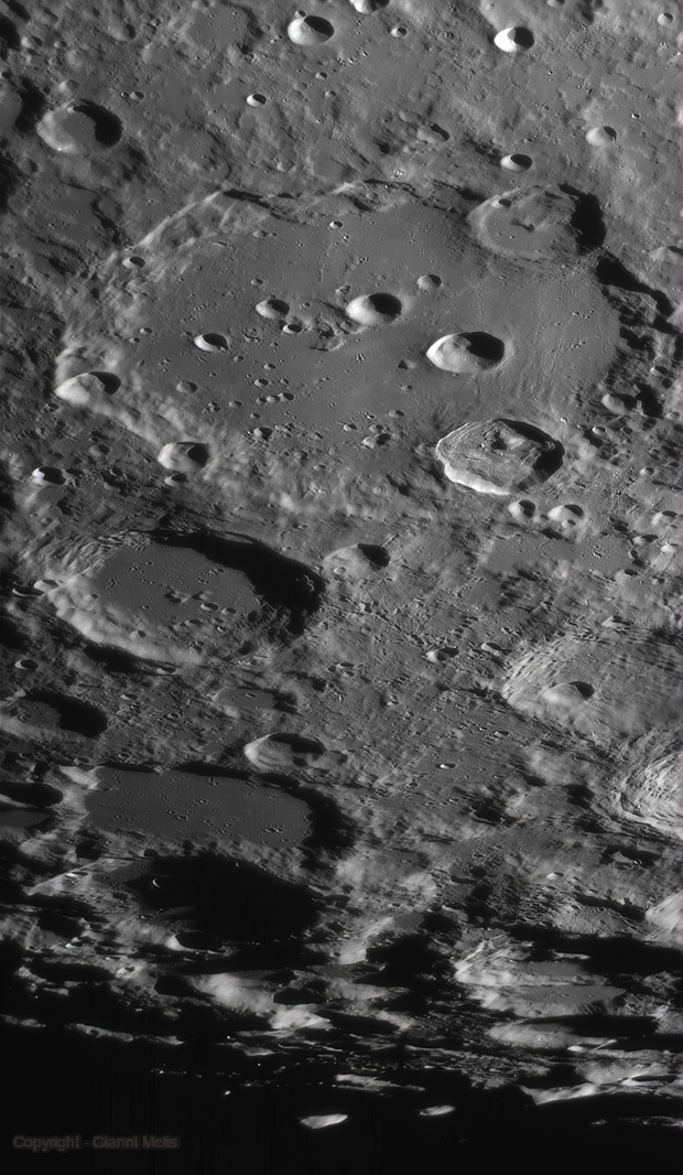 Clavius è uno dei più grandi crateri da impatto complessi degli altopiani lunari meridionali, con un diametro di circa 225 km. Le sue pareti terrazzate, fortemente erose, riflettono un’antica formazione seguita da una lunga sequenza di impatti successivi. Il fondo relativamente pianeggiante ospita la ben nota catena arcuata di crateri interni che definisce la morfologia distintiva di Clavius. All’interno del bacino spiccano Rutherford, il più grande e meglio conservato, seguito da Porter, Clavius D, Clavius C, Clavius N e Clavius J, disposti in una sequenza decrescente che illustra chiaramente la sovrapposizione dei crateri e la cronologia relativa degli impatti. Il terreno circostante è rappresentativo degli altopiani meridionali, estremamente craterizzato e strutturalmente complesso, con grandi formazioni erose come Blancanus e Scheiner visibili in tutto il campo. La scarsa illuminazione solare esalta il rilievo e i dettagli strutturali più fini, sottolineando l’età avanzata di questa regione. Immagine acquisita con un telescopio Celestron C14 alla sua lunghezza focale nativa, una fotocamera ZWO ASI 290MM e un filtro RED Astrodon Gen.2, ottimizzato per l’imaging lunare ad alta risoluzione.
