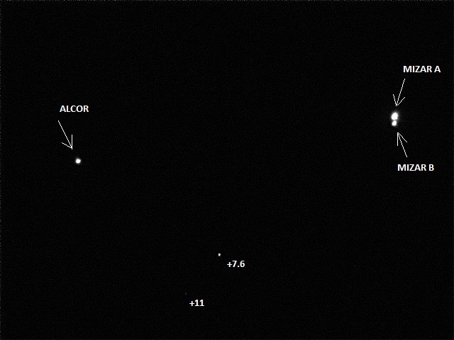la stella doppia mizar-alcor nell’ orsa maggiore separate da 11,8 primi con mizar a sua volta doppia con mizar A e mizar B separate da 14".