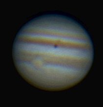 in questa immagine ho ripreso sia la macchia rossa di giove che il transito di io. il giorno 01/08/08 ho ripreso un po di immagini di giove e questa e uno dei migliori risultati che ho ottenuto,si nota sia la macchia rossa che l’ombra di io sul pianeta.