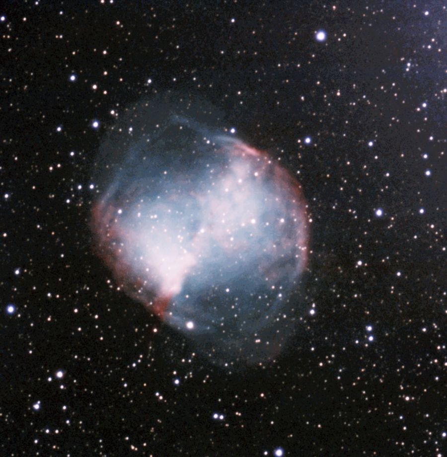 una ripresa fatta dal centro città della nebulosa M27 Dumbell senza nesusn filtro anti inquinamento luminoso e al fuoco diretto del telescopio Skywatcher 120ED focale 900, e camera Asi 224mc color.