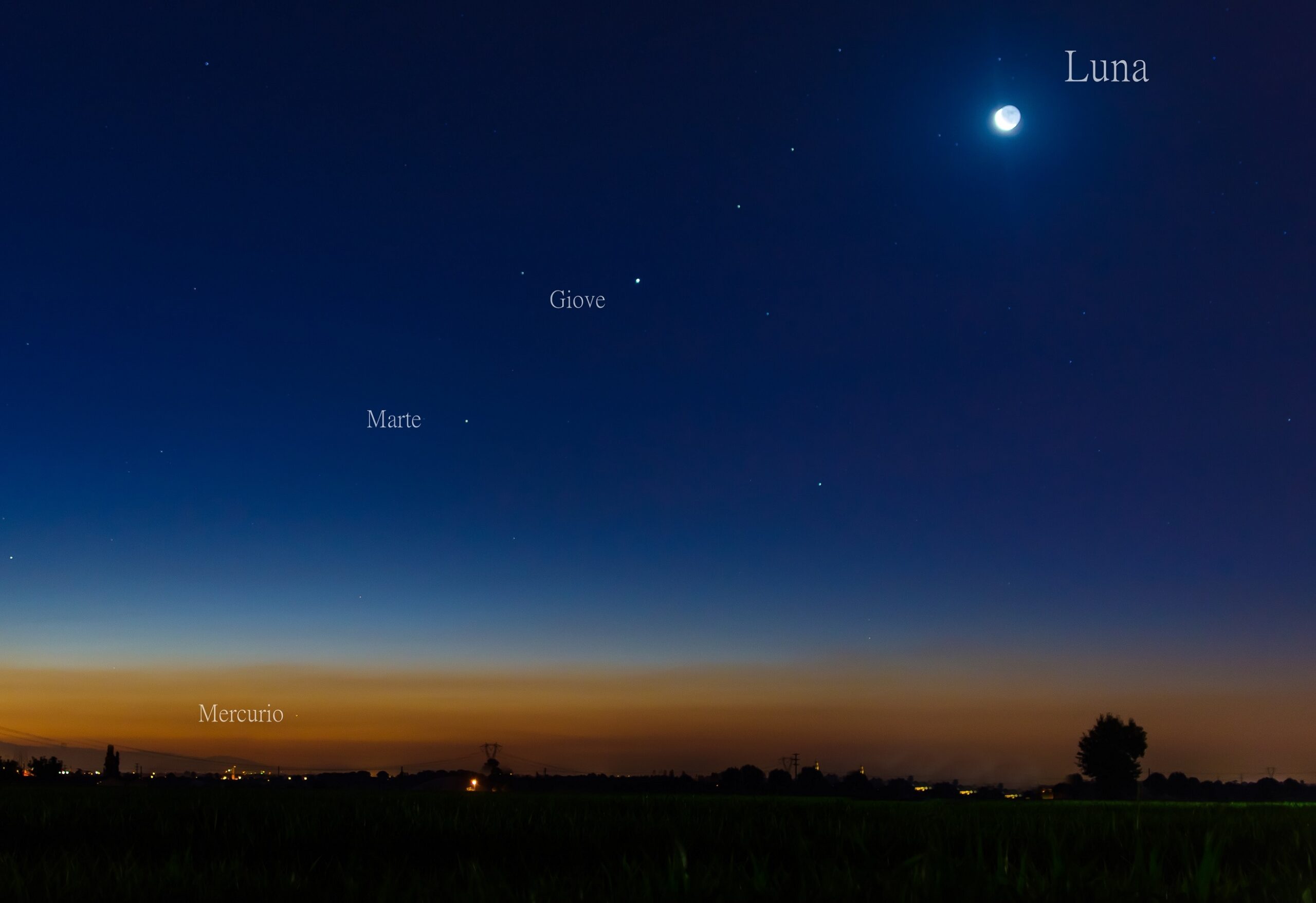 La mattina del 3 agosto ero indecisa se alzarmi o meno ma mi sono fatta coraggio e così sono riuscita ad immortalare tre pianeti (Mercurio, Marte, Giove) insieme alla Luna… Una bella soddisfazione!