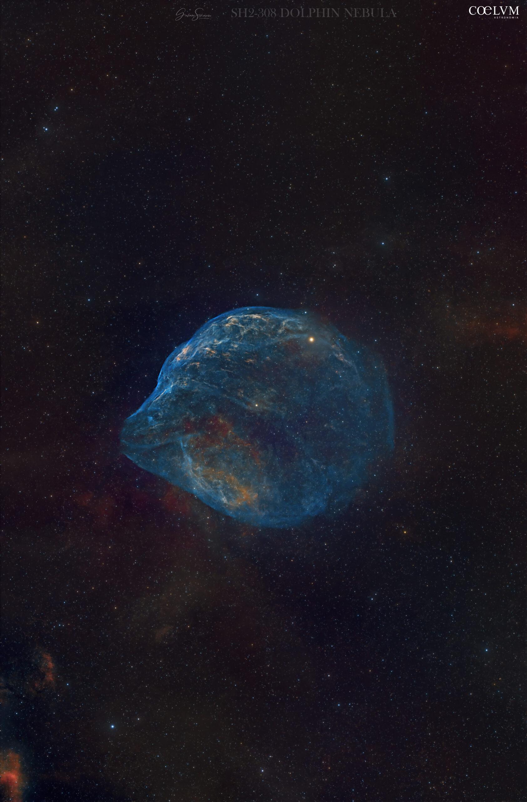 Sh2-308, la Nebulosa Delfino, è anche nota come RCW 11 e LBN 10521. È una nebulosa a emissione e una regione HII situata nella costellazione del Cane Maggiore. La sua distanza stimata varia tra 1.875 e 5.800 anni luce, a seconda della sorgente. La nebulosa si è formata dall’espulsione degli strati esterni della stella EZ Canis Majoris circa 70.000 anni fa. Filter: Antlia alpt H/OIII 5nm Camera: Asi 2600 mc pro Telescope: Askar 103 apo rid 0.8x Guide scope: Svbony 60/240 Camera guida: Asi 120 mini mm Mount: Skywatcher Eq 6-r Pro Acquisition: Asiair Mini Software: DSS – Pixinsight – Photoshop Shots: 26/02/2026 Location: Porto Cesareo (LE) ITALY SQM 20.81 Author: GIULIANO SCHIAVONE
