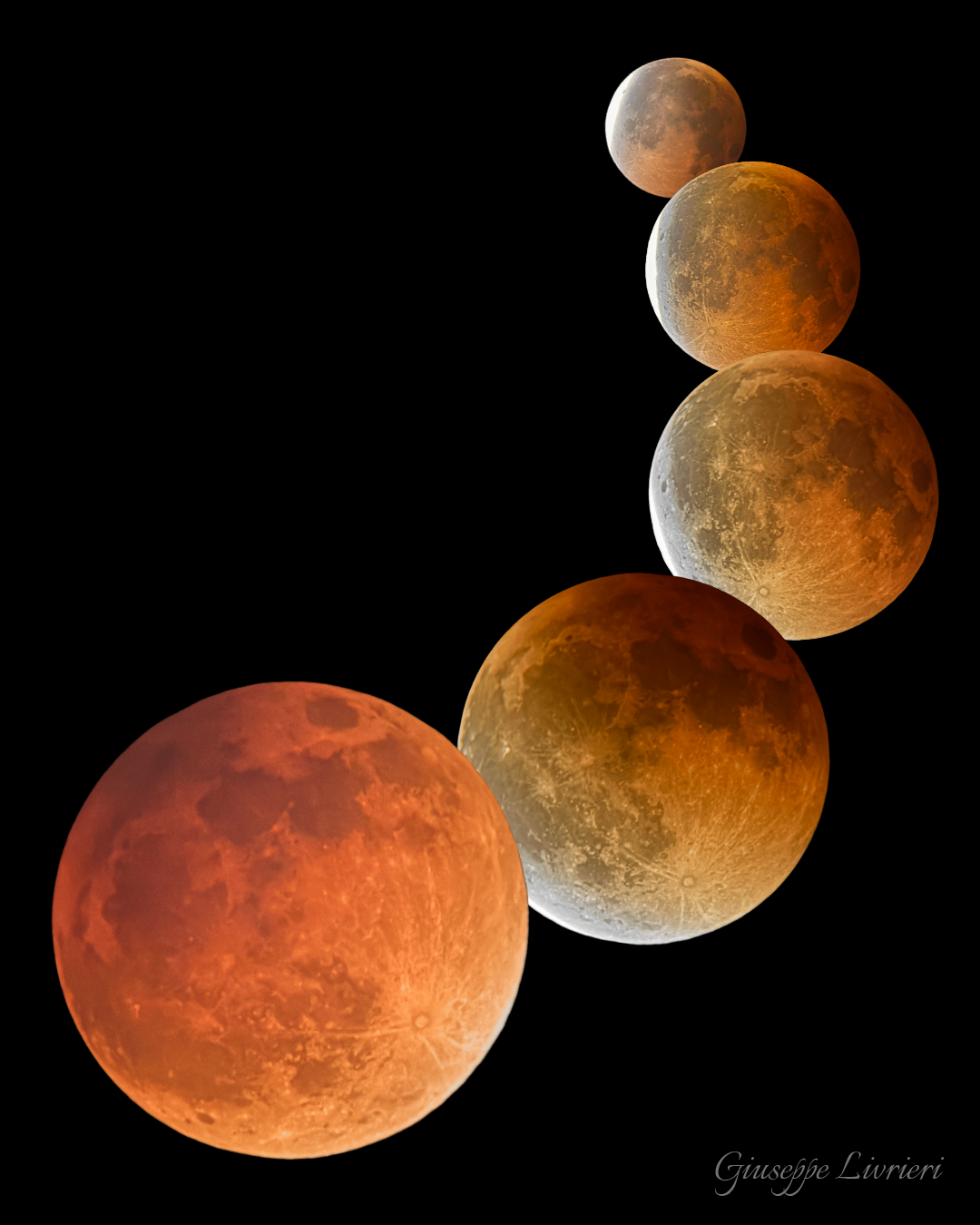 Questa che vedete è una composizione di alcune delle fasi dell’eclissi lunare totale di questo settembre. Ho acquisito le foto con un telescopio dobsoniano da 25 cm di diamero e con una camera planetaria. Successivamente ho unito i risultati con Photoshop.
