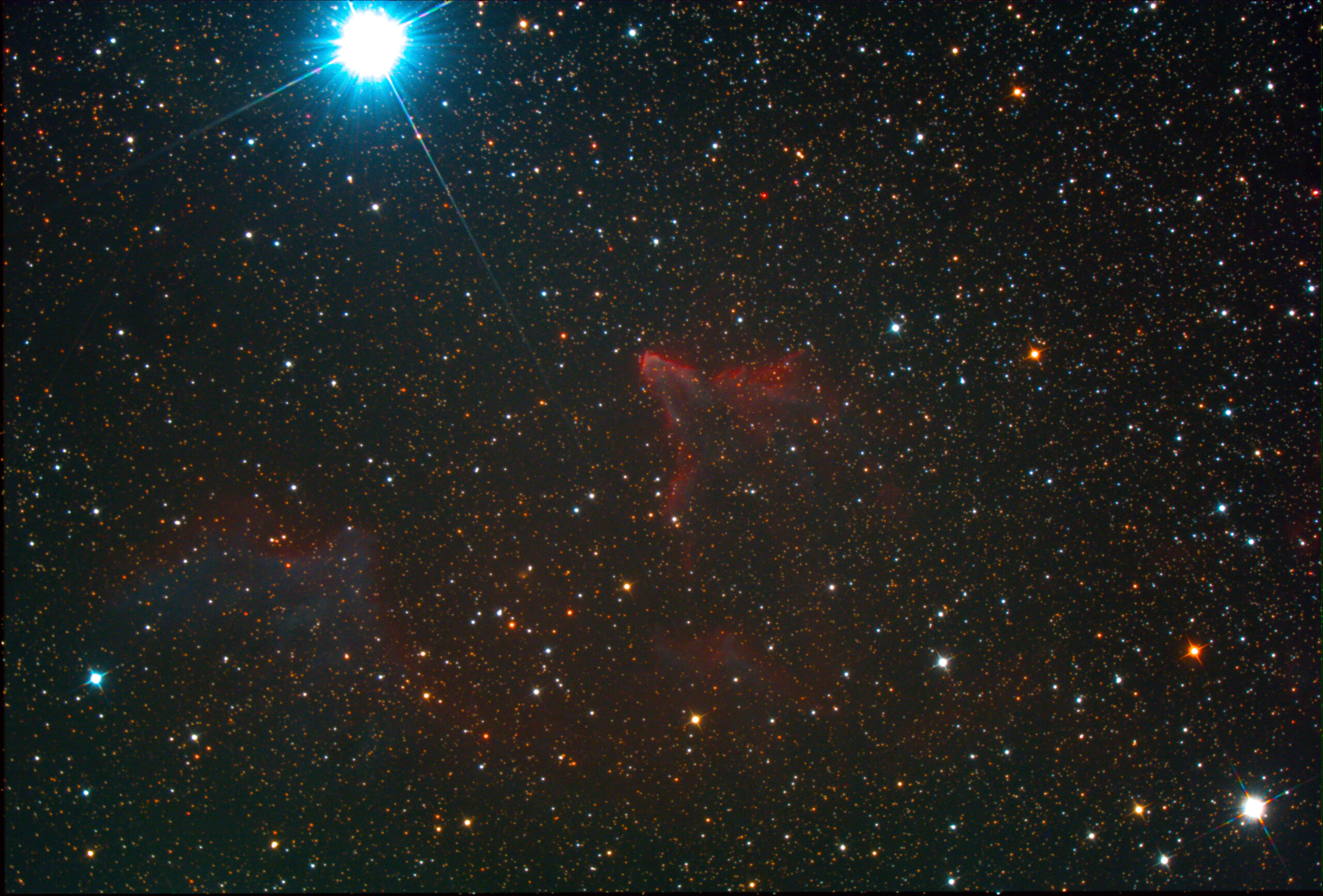 IC 59 e IC 63 sono una nebulosa a riflesssione e emissione che si trova nella Costellazione di Cassiopea, nelle vicinanze di una stella sorprendente e nota come Gamma Cassiopeiae, una subgigante bianco-azzurra, variabile eruttiva circondata da un disco gassoso. L’astro ardente, che risplende a circa 550 anni luce di distanza da noi, è 19 volte più massiccio e 65.000 volte più brillante del Sole e ruota all’incredibile velocità di 1,6 milioni di chilometri all’ora, oltre 200 volte più velocemente rispetto alla nostra stella.