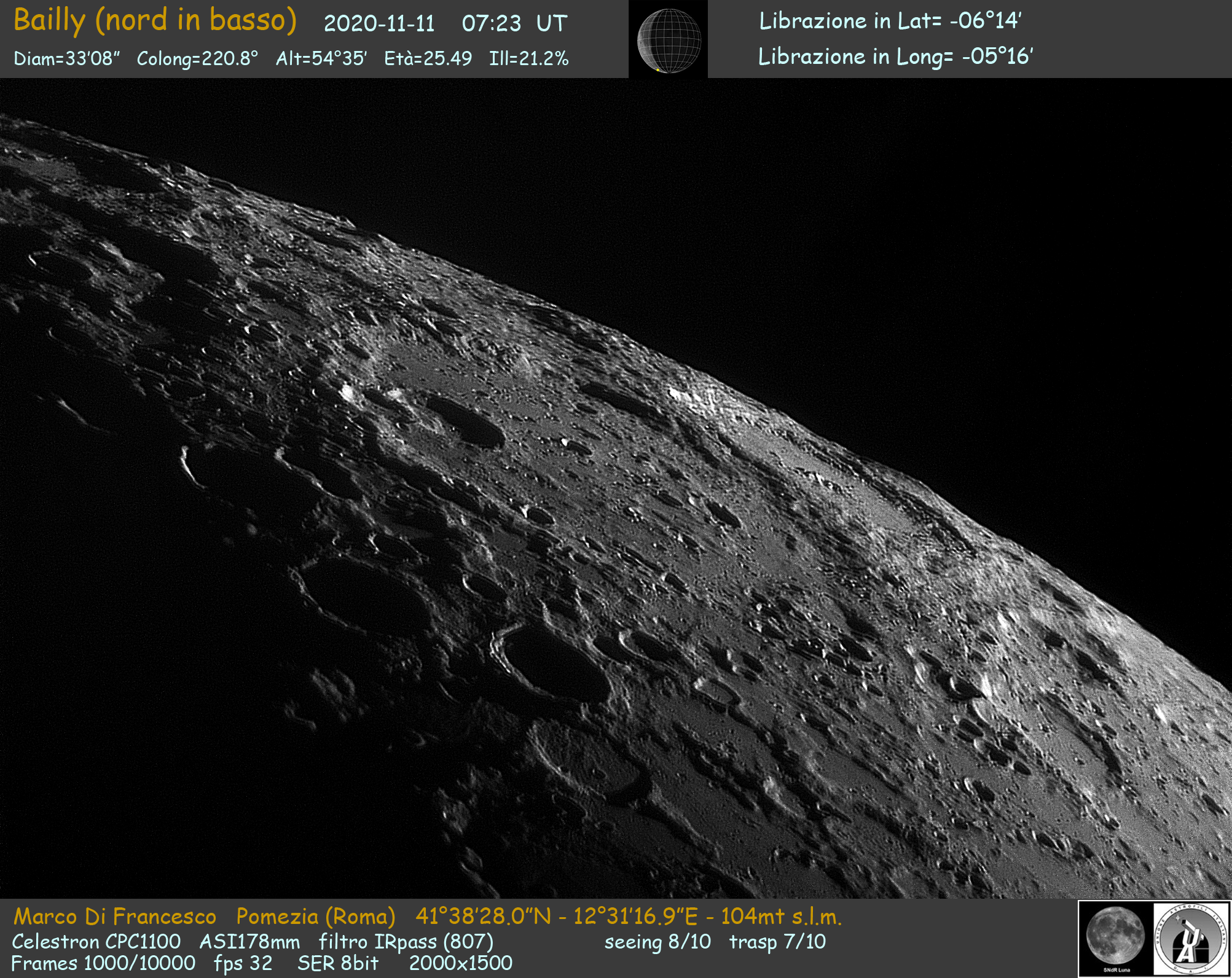 Per la rara coincidenza della librazione favorevole, la vicinanza del terminatore e un ottimo seeing, Bailly si mostra in tutto il suo splendore.