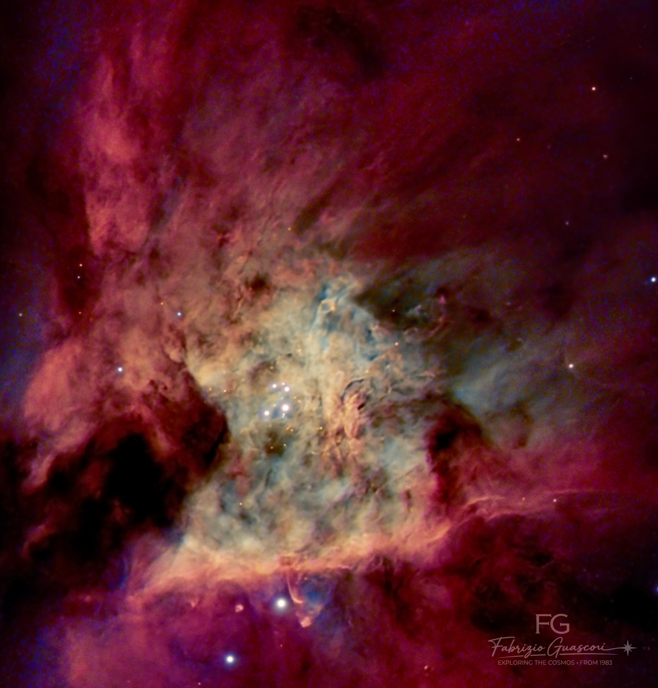 La ripresa evidenzia l’ammasso stellare del Trapezio e le strutture gassose della regione centrale della nebulosa. La ricchezza di dettagli nella struttura interna è il risultato della violenta interazione tra le stelle del Trapezio e i gas circostanti: le radiazioni e i venti stellari comprimono la materia creando onde d’urto, filamenti e cavità profonde. L’uso del filtro H-alpha per la luminanza ha permesso di isolare queste delicate trame di idrogeno, staccandole nettamente dal fondo cielo cittadino e dalle nubi di polvere oscura. La resa cromatica finale, elaborata dai dati del filtro L-Quad, riflette un’interpretazione personale volta a esaltare i contrasti e le sfumature di questa complessa nursery stellare. Luminanza: 10min (scatti da 10sec) con filtro H-alpha. Colore: 22min (scatti da 1 min) con filtro L-Quad. Integrazione totale: 32 minuti.