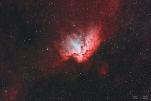 L’immagine invece è il risultato di circa 11 ore di esposizione sotto un cielo Bortle 5, utilizzando un filtro interferenziale a doppia banda a 3nm. Il colore delle stelle è stato ottenuto in maniera sintetica con metodo Ballestreros.