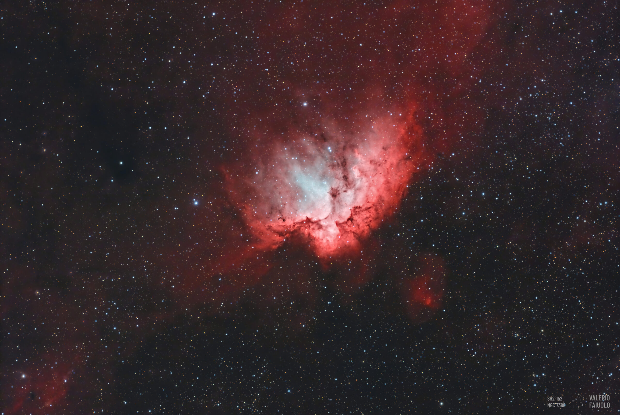 NGC 7380 è un ammasso molto giovane (si stima che abbia un’età di circa 10 milioni di anni) e le stelle al suo interno contribuiscono a ionizzare i gas della nebulosa di origine: sono presenti infatti una notevole quantita di HA (idrogeno ionizzato, dal tipico colore rosso) e in maniera inferiore OIII (ossigeno ionizzato due volte, dal colore acquamarina).