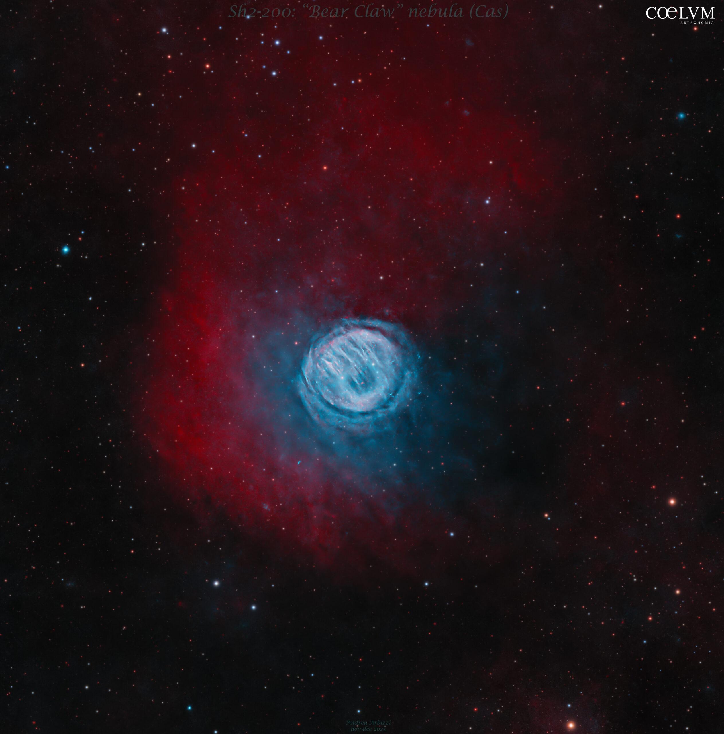 Sh2-200, conosciuta anche come “Artiglio d’Orso”, è una nebulosa planetaria debole e piuttosto evanescente nella costellazione di Cassiopea. Tecnosky Owl Pro 110 F4,8 (525 mm) Zwo Asi 2600 Air, Asi 2600 MM Proxisky Umi20S Zwo AsiAir Plus nov – dic 2025 Optolong Ha 3nm: 44X600” Antlia Ha 4.5nm: 19X600” Optolong O3 3nm: 57X600” Antlia O3 4.5nm: 7X600” Tot: 21h 10’ Modena (Sqm 18.4-18.8 Bortle 7,5-8), Italy Monte Maggio, (GE) (Sqm 20.45 Bortle 5), Italy