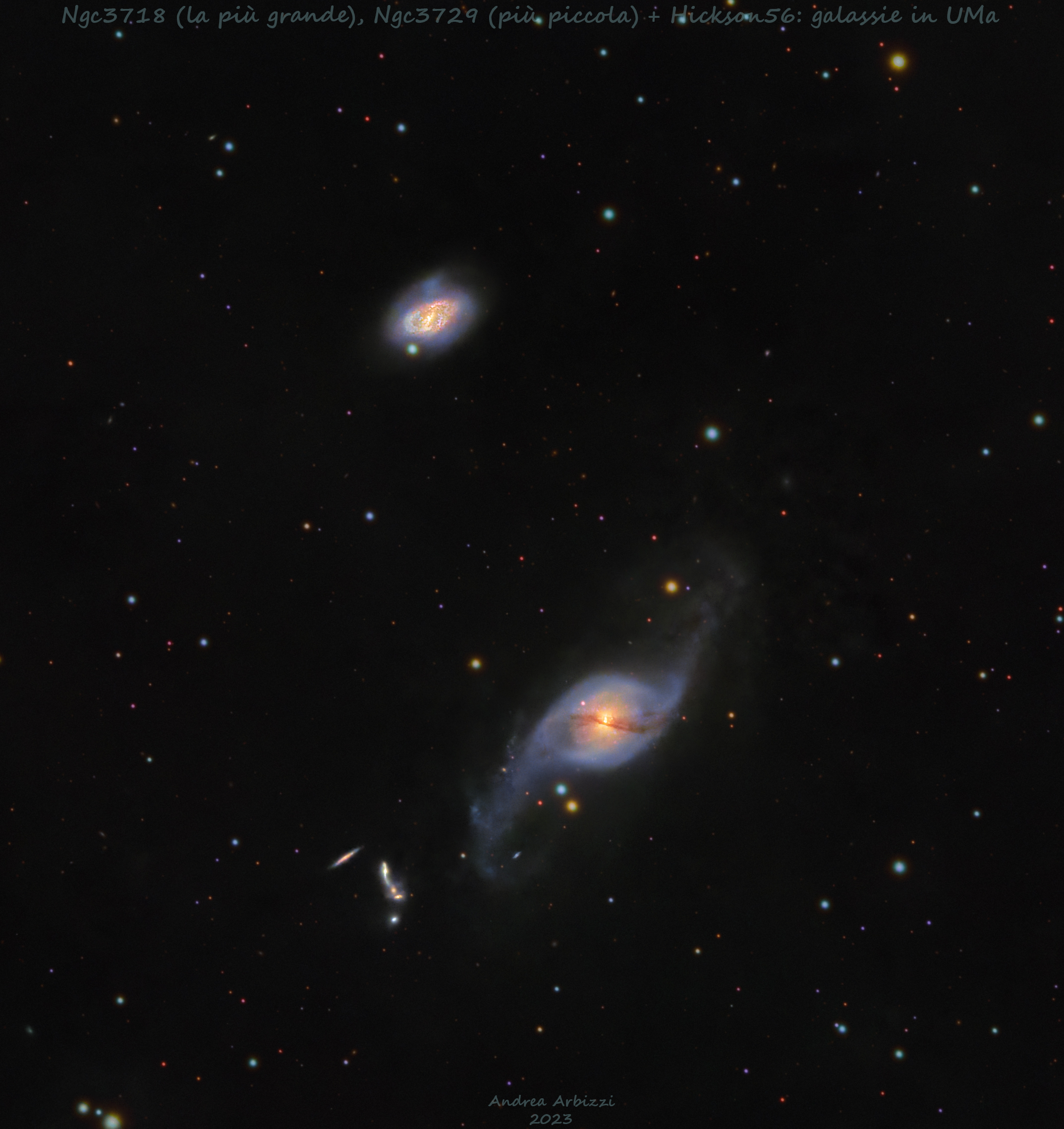 NGC 3718, la più grande, è una galassia a spirale barrata in basso a destra nell’immagine. La sua forma particolare è probabilmente il risultato delle interazioni gravitazionali con la galassia a spirale più piccola, NGC 3729, in alto a sinistra. Sotto a NGC 3718 si trova il Gruppo compatto di galassie Hickson 56, composto da cinque galassie che interagiscono tra loro. Queste galassie non sono più piccole come sembrano nell’immagine: sono invece circa otto volte più lontane rispetto a NGC 3718 e NGC 3729.