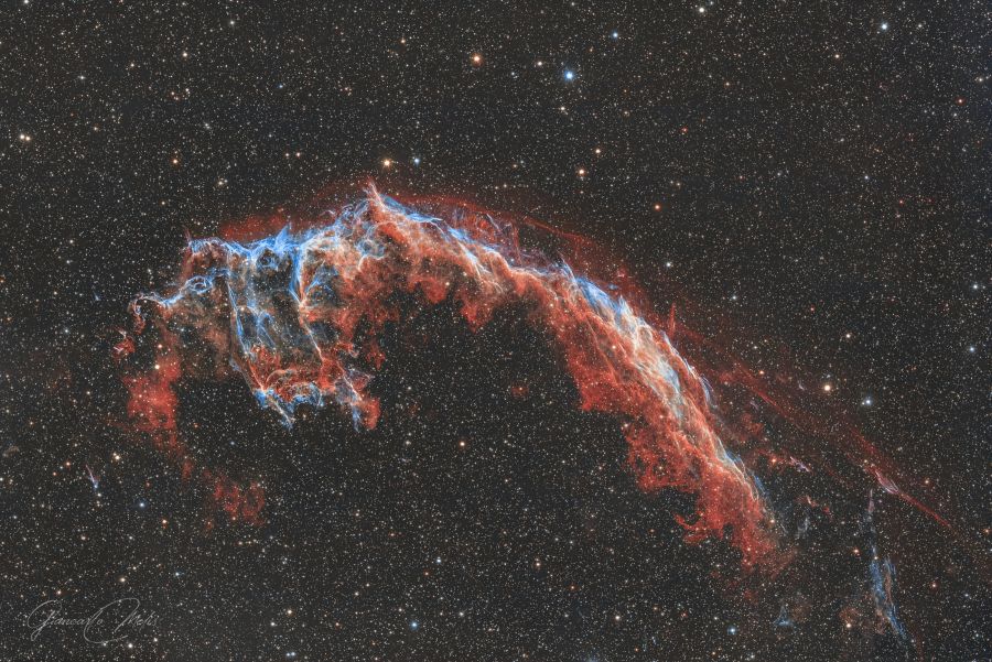La nebulosa NGC 6992/6995, parte orientale della Veil nebula nella costellazione del Cigno. Queste velature di gas sono il residuo dell’immane esplosione di una supernova. L’immagine, ripresa dal cortile di casa, è stata ottenuta con l’astrografo Celestron RASA 8" (400mm di lunghezza focale a f/2). La camera di ripresa usata è la ASI 183 MC-Pro, tutto su montatura Skywatcher EQ6-R Pro guidato con un mini cannocchiale guida e la camera ASI 120 M-Mini. Dati tecnici: Temperatura di ripresa: -10°C 100 Light frames da 120" 30 Dark 30 Bias Elaborazione effettuata con PixInsight e Photoshop CC. Versione rielaborata con un differente workflow su pixinsight.
