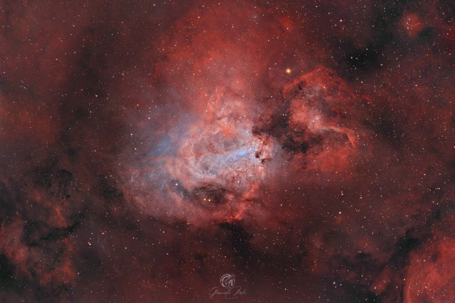 Estesa per 15 anni luce e composta da gas e polveri ionizzati, brilla grazie alle giovani stelle massicce al suo interno. Affascinato dalle storiche immagini sugli atlanti stellari, essendomi trasferito in un luogo buio e con l’orizzonte sud libero, ho deciso di riprendere M17 con i miei strumenti amatoriali.