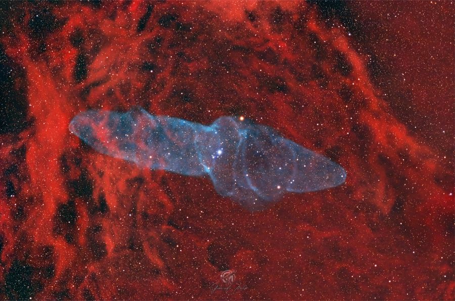 La nebulosa OU4 detta amichevolmente "Calamaro", una zona OIII piuttosto flebile, immersa nella ben più accesa SH2-129 "Pipistrello volante", una nebulosa ad emissione in HII, nella costellazione Cefeo.