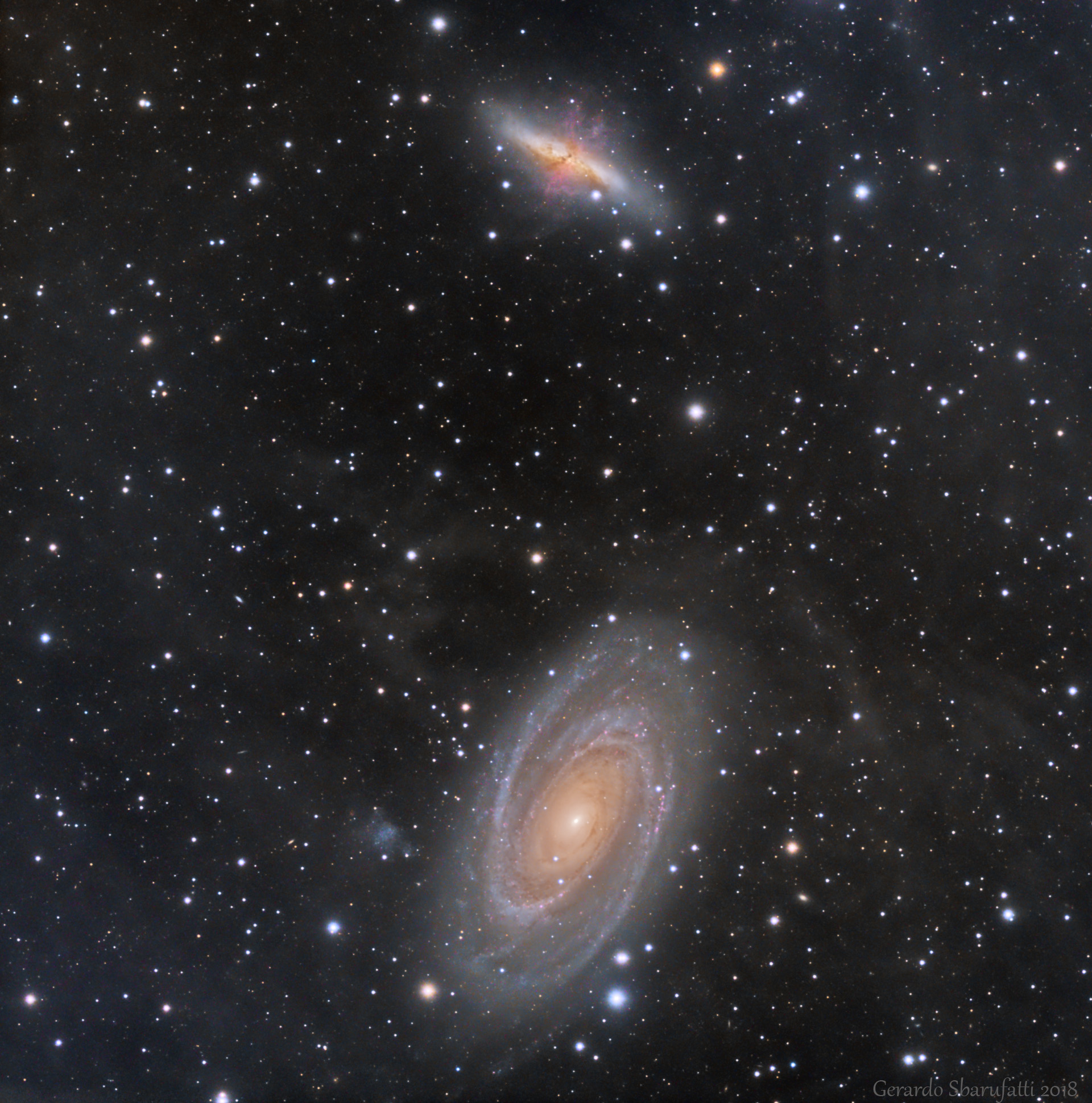 Splendida coppia di galassie nell’Orsa Maggiore, M81 la componente maggiore del "Gruppo di galassie M81" e M82 famosa per i jet visibili nella luce dell’idrogeno.